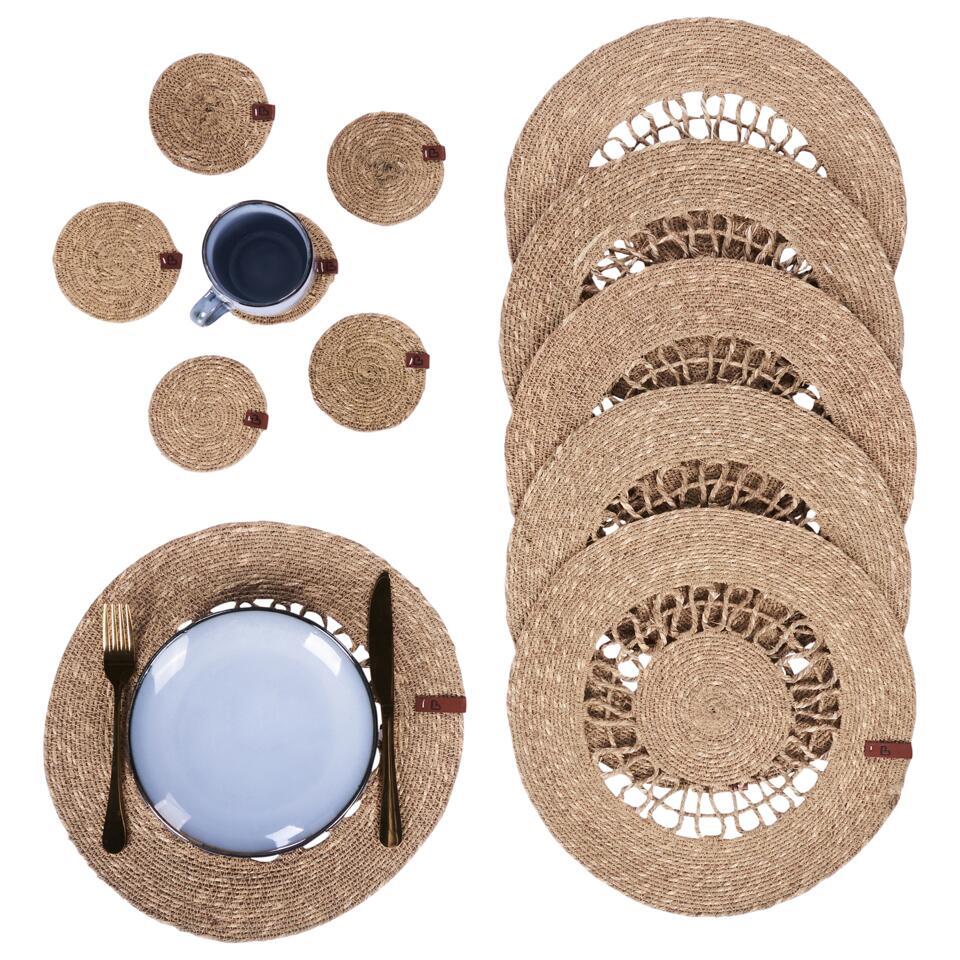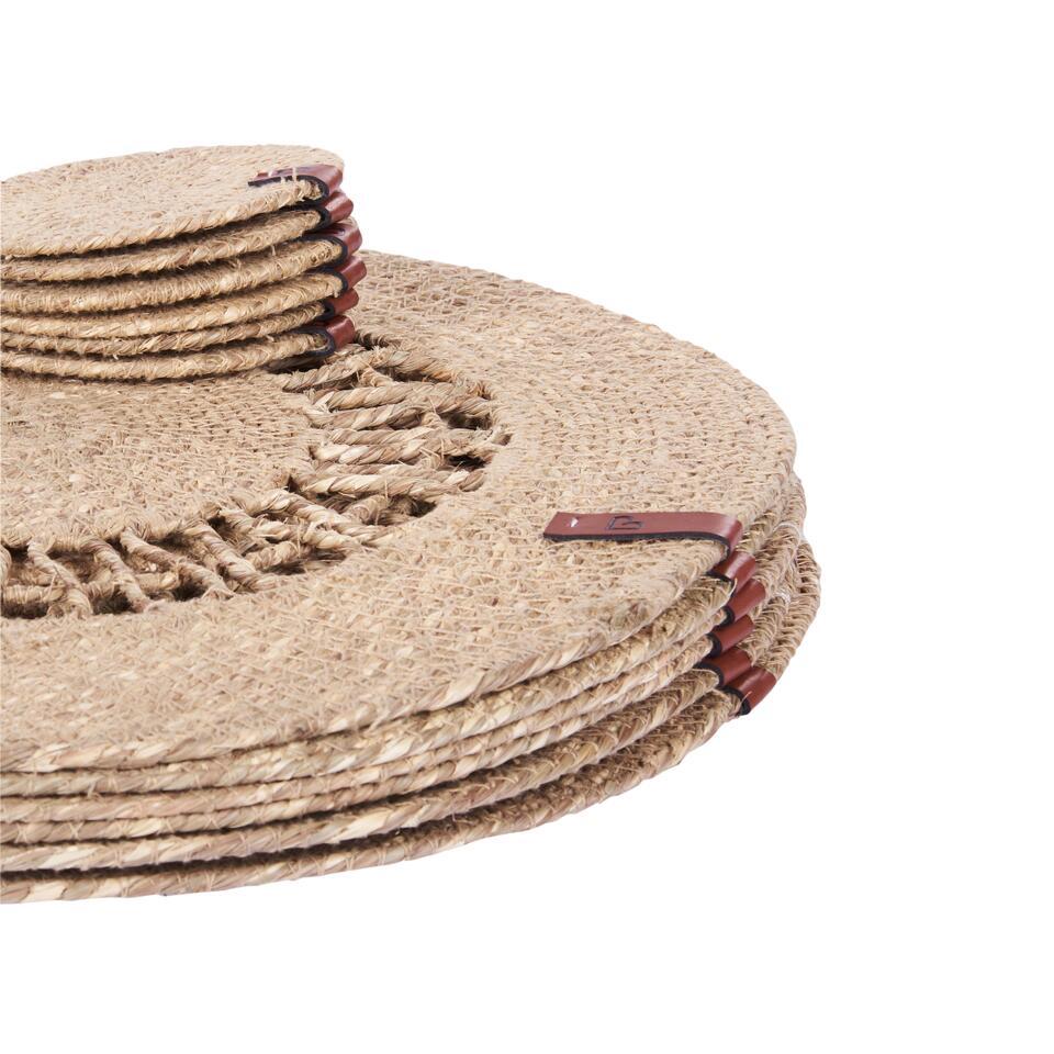 Lot sets de table et dessous de verre ronds faits à la main. Apportez la beauté de l'ambiance rustique dans votre maison avec ces élégants sets de table et sous-verres en jonc de mer. Tressés à la main à partir d'herbes marines naturelles, ces articles ajoutent une touche de charme bohème à votre table à manger. Le design texturé unique et la palette de couleurs naturelles s'adaptent à tous les styles d'intérieur.