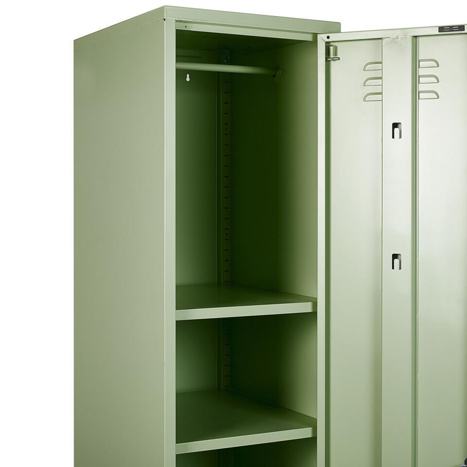 Vestiaire de rangement en acier au style industriel. La construction stable et soudée en acier et la porte battante verrouillable de cette armoire garantissent la sécurité de tous vos documents confidentiels. Les étagères amovibles vous permettent de ranger quelque chose de plus grand. Le meuble peut se transformer en penderie grâce aux crochets de porte pratiques, de petits éléments décoratifs peuvent être placés ou des vêtements peuvent être suspendus. Combiné avec d'autres armoires à double porte, il peut servir de séparateur de pièce. De plus, le modèle est pourvu de fentes d'aération et est très facile à nettoyer.