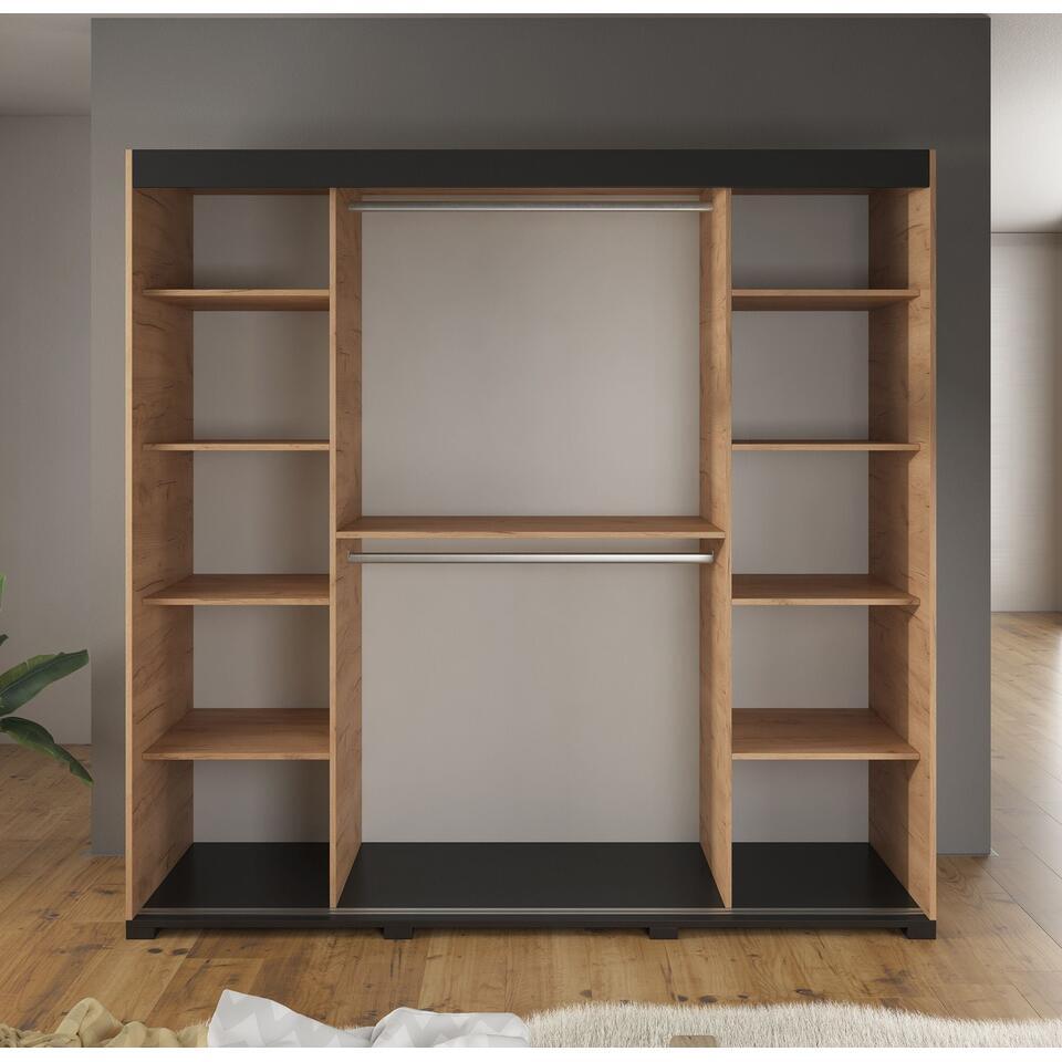 L'armoire Brazil est dotée de 2 portes coulissantes, toutes deux équipées d'un miroir. L'intérieur se compose de 2 tringles à vêtements et de 10 compartiments de rangement. L'armoire est fabriquée en bois mélaminé robustes. Dimensions : 200x62x200 cm.