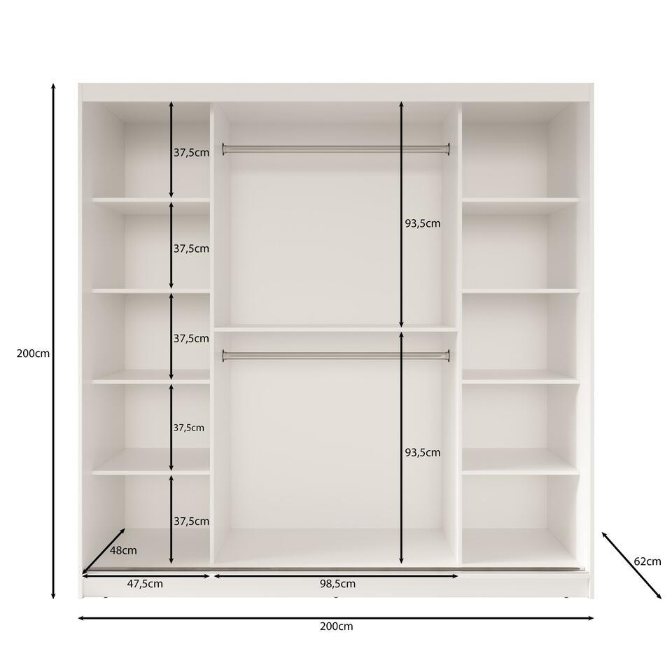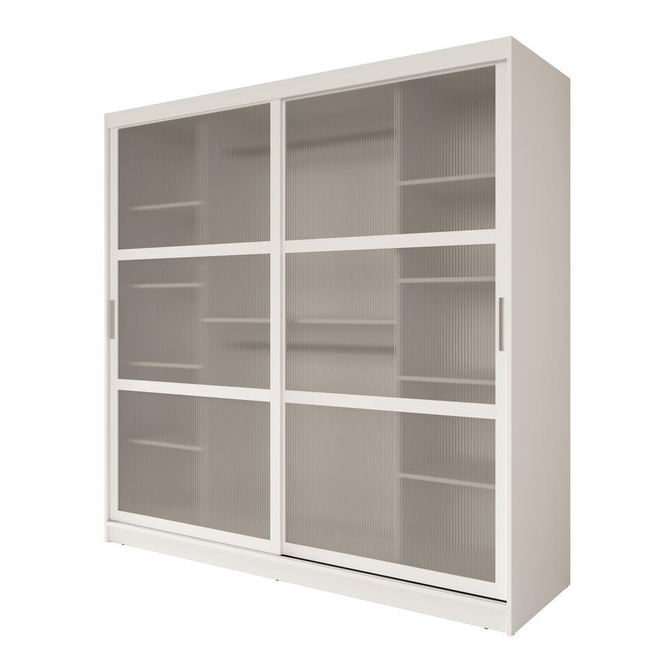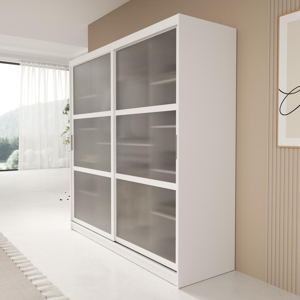 L'armoire Fessaro dispose de deux portes coulissantes qui s'ouvrent à l'aide de poignées argentées. Les portes sont dotées d'un verre strié qui confère à l'armoire un aspect luxueux et chic. À l'intérieur, vous trouverez dix compartiments de rangement et deux tringles à vêtements. Dimensions : 200x62x200 cm.