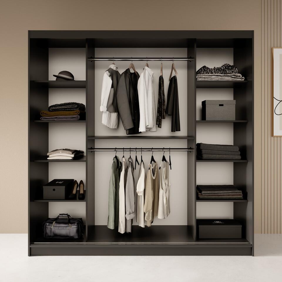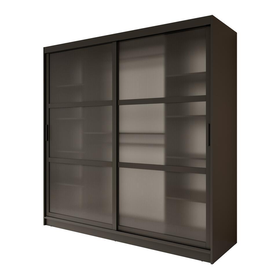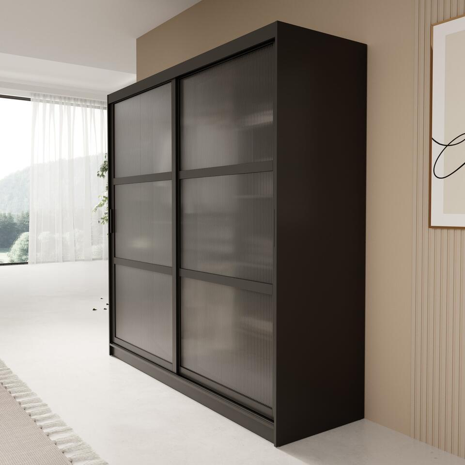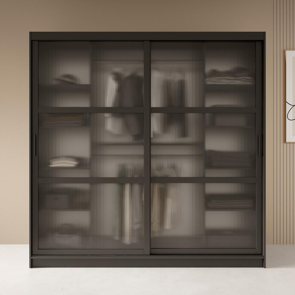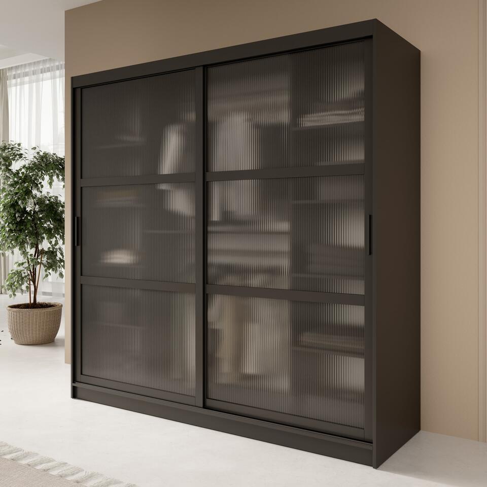 L'armoire Fessaro dispose de deux portes coulissantes qui s'ouvrent à l'aide de poignées noires. Les portes sont dotées d'un verre strié qui confère à l'armoire un aspect luxueux et chic. À l'intérieur, vous trouverez dix compartiments de rangement et deux tringles à vêtements. Dimensions : 200x62x200 cm.
