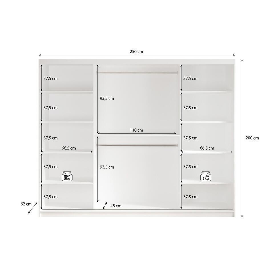 L'armoire en Marmer dispose de 3 portes coulissantes avec miroir qui s'ouvrent avec des poignées dorées. L'intérieur se compose de 10 compartiments de rangement et de 2 tringles à vêtements. L'armoire est constituée d'une construction robuste en bois mélaminé. Dimensions : 250x62x200 cm.