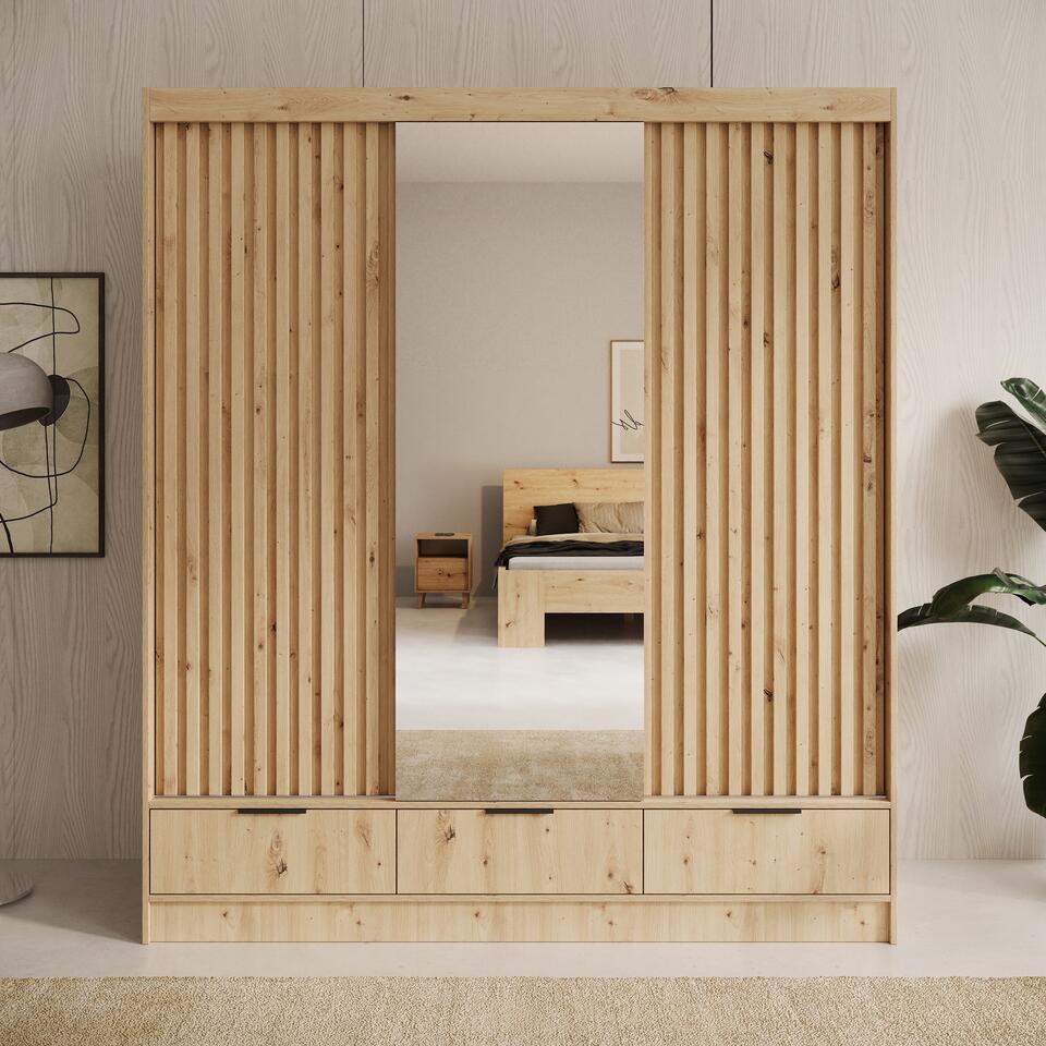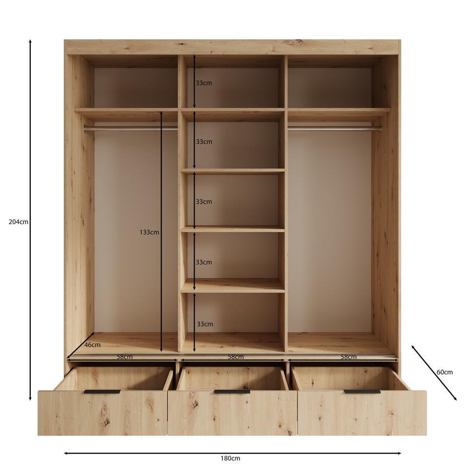 L'armoire Venn est équipée de 3 portes coulissantes et de 3 tiroirs qui s'ouvrent à l'aide de poignées noires. La porte centrale est équipée d'un miroir. L'intérieur se compose de 7 compartiments de rangement et de 2 tringles à vêtements. L'armoire est disponible en couleur chêne. Dimensions : 180x60x204 cm.