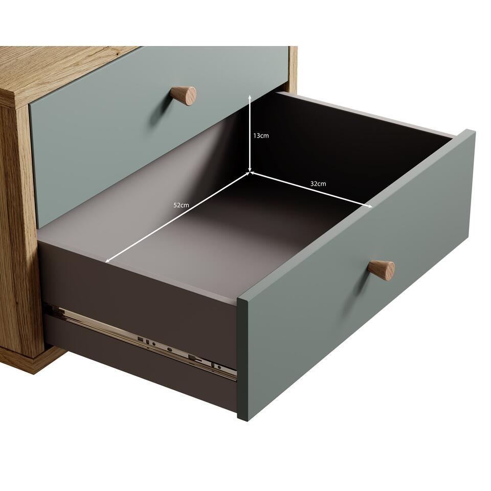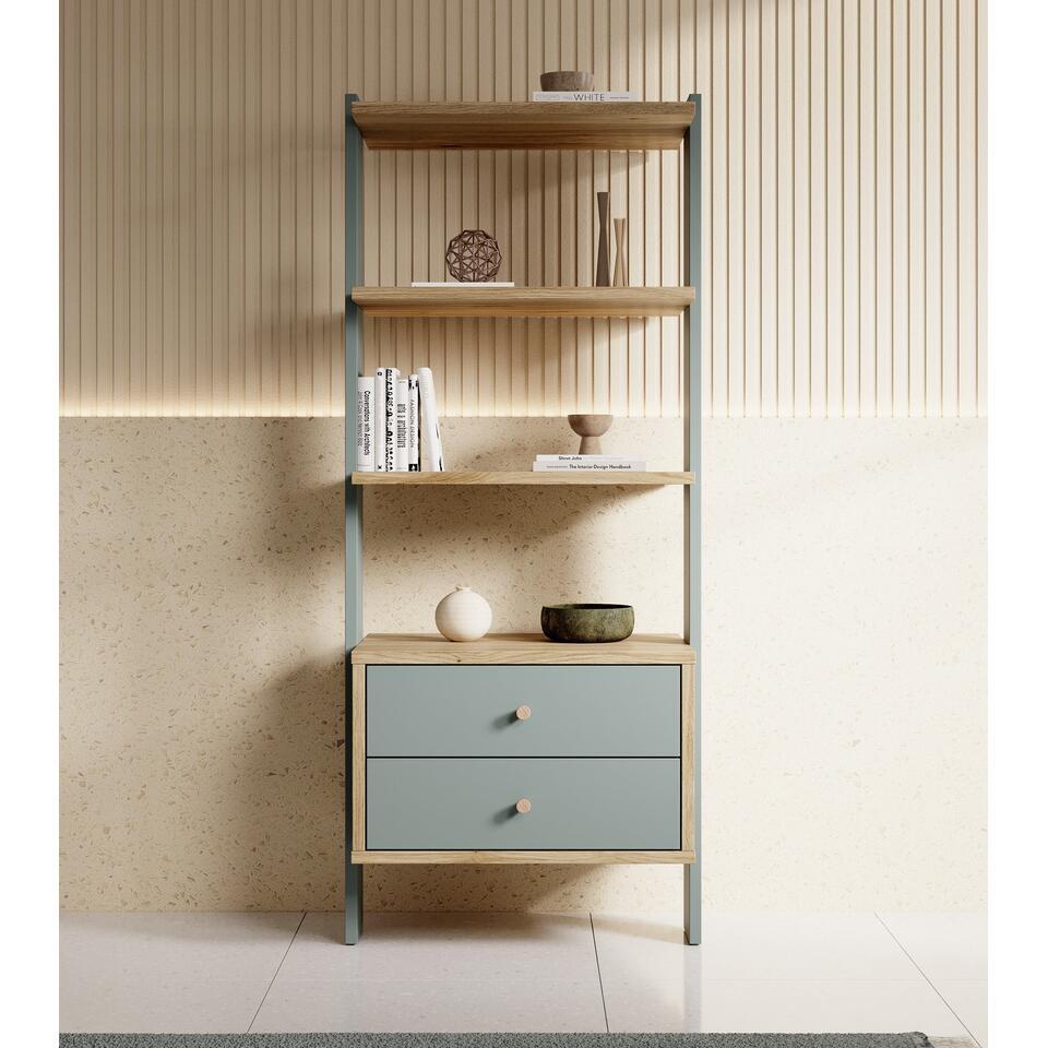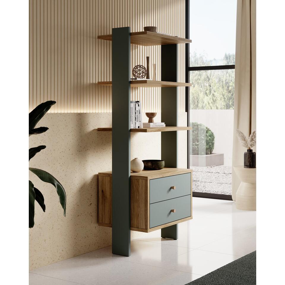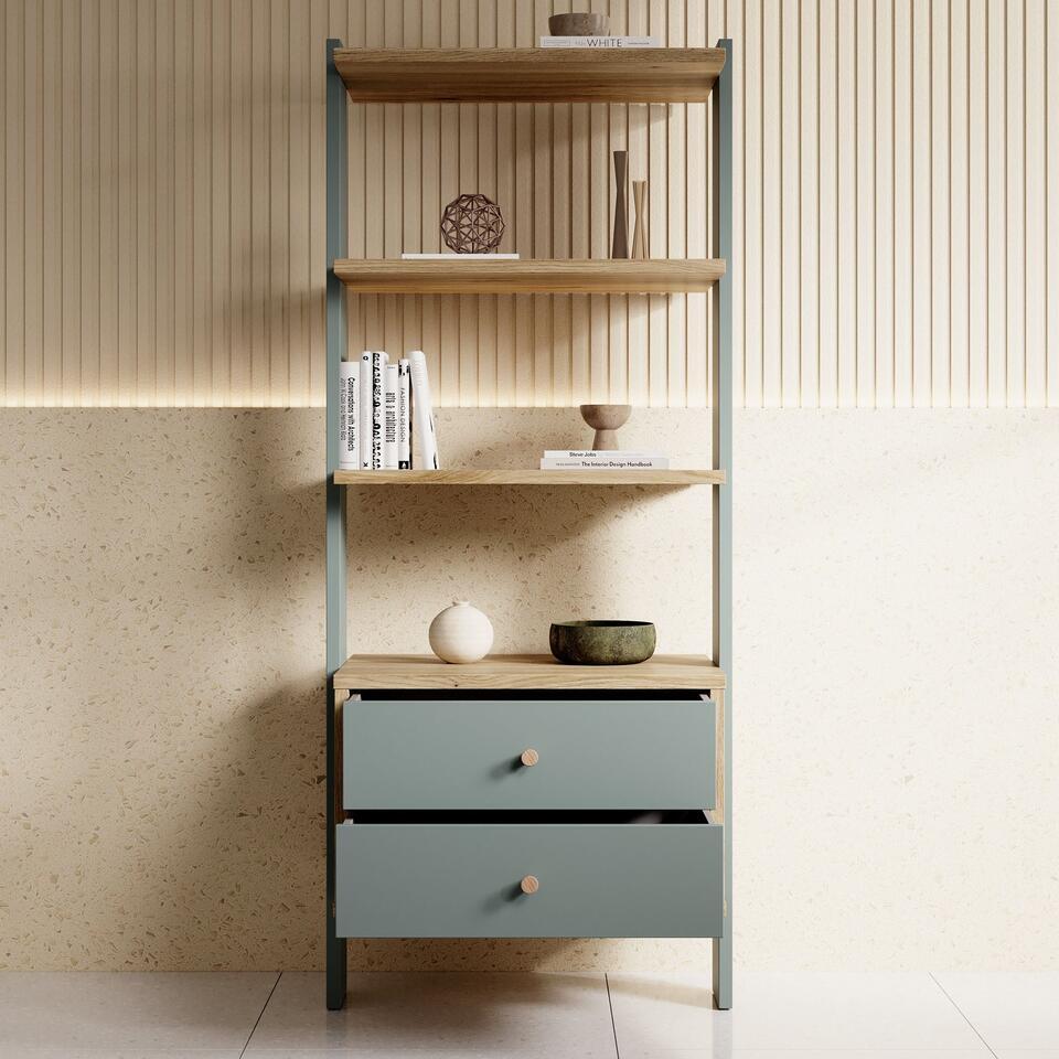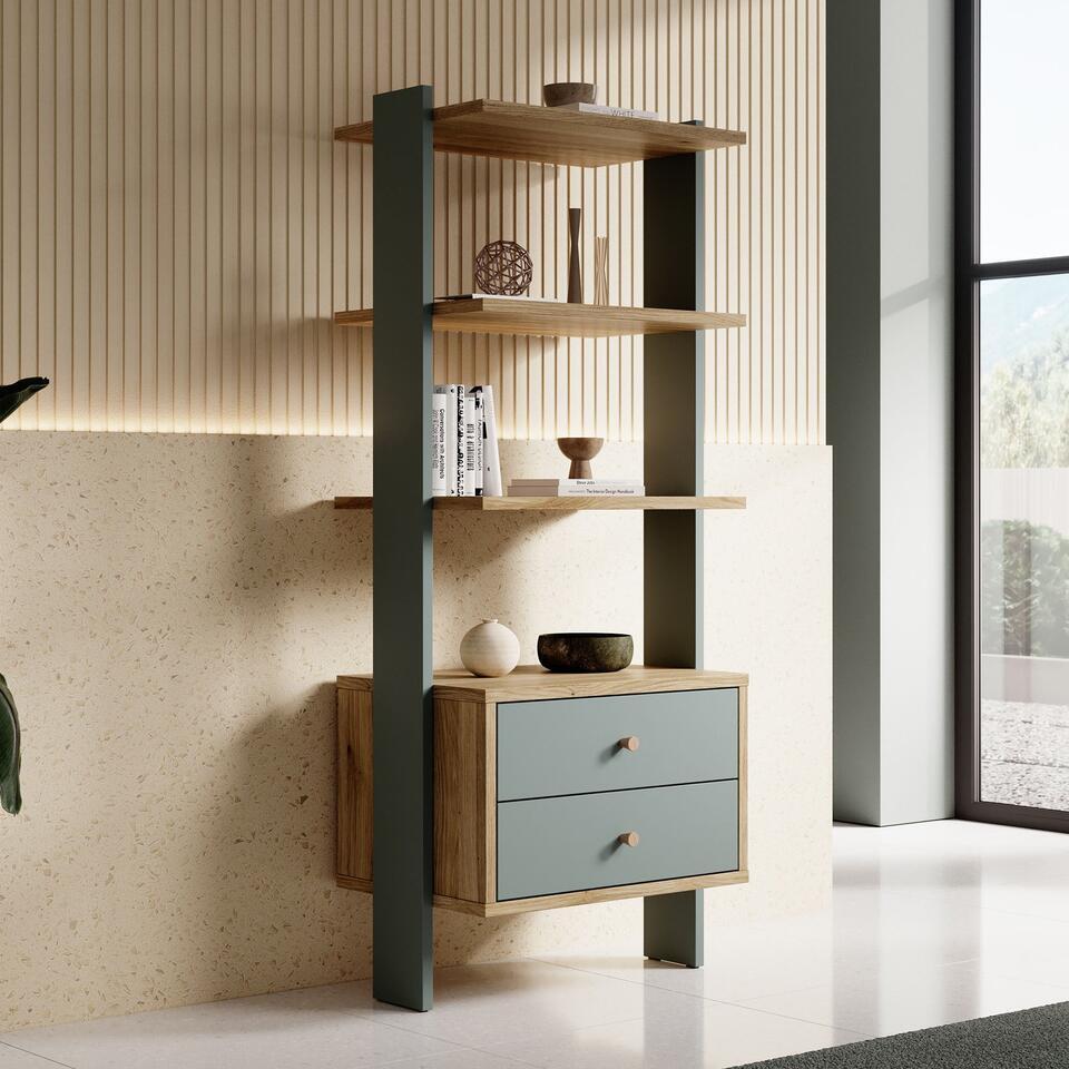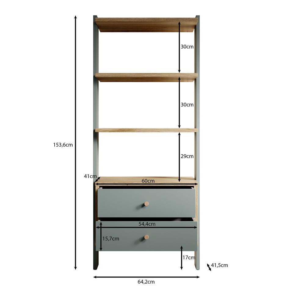 La bibliothèque Wally comporte 2 tiroirs qui s'ouvrent avec des boutons. Au-dessus de ces tiroirs se trouvent 3 étagères. La finition de l'armoire est de couleur verte avec du chêne. Le Wally a un look moderne. Dimensions : 64x42x154 cm.