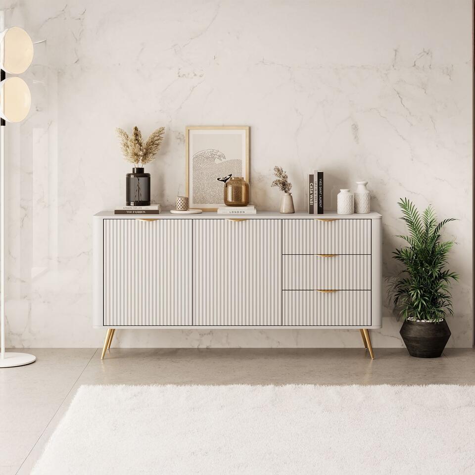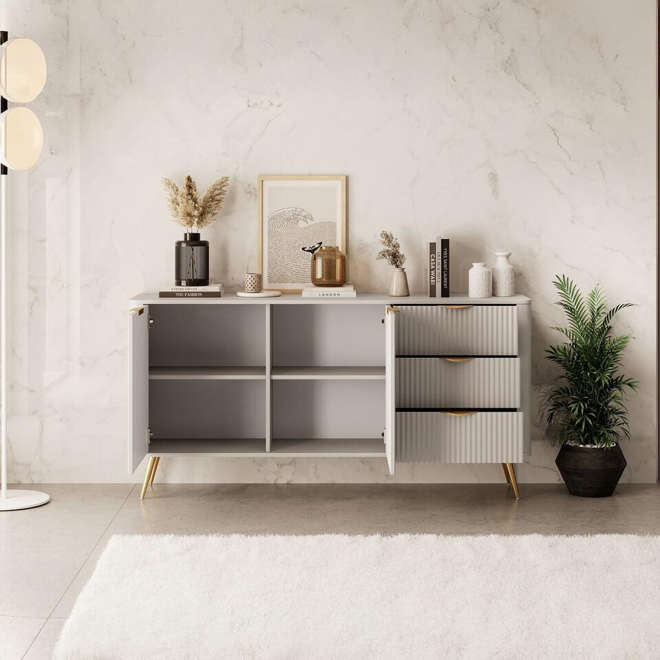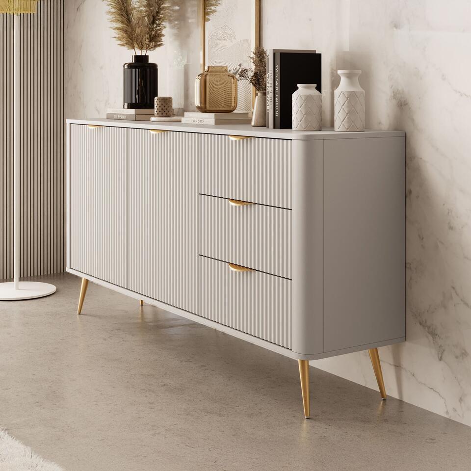 Le buffet Lima est de couleur beige. Le meuble de rangement comporte 3 tiroirs et 2 portes derrière lesquels se trouvent 4 compartiments de rangement. Les tiroirs et les portes s'ouvrent à l'aide de poignées dorées. Le meuble repose sur des pieds en métal de couleur dorée. Dimensions : 163x38x81 cm.