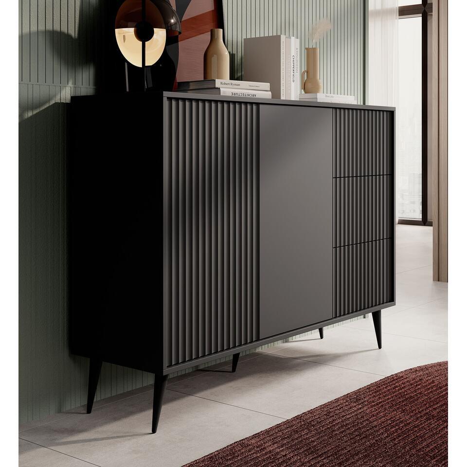 Le Winq comprend 3 tiroirs et 2 portes avec 2 compartiments de rangement derrière eux. Les tiroirs et les portes ont un motif à lamelles et s'ouvrent grâce au système push-to-open. L'armoire est fabriquée en bois mélaminé robustes et repose sur des pieds noirs. Dimensions : 135x40x98 cm.
