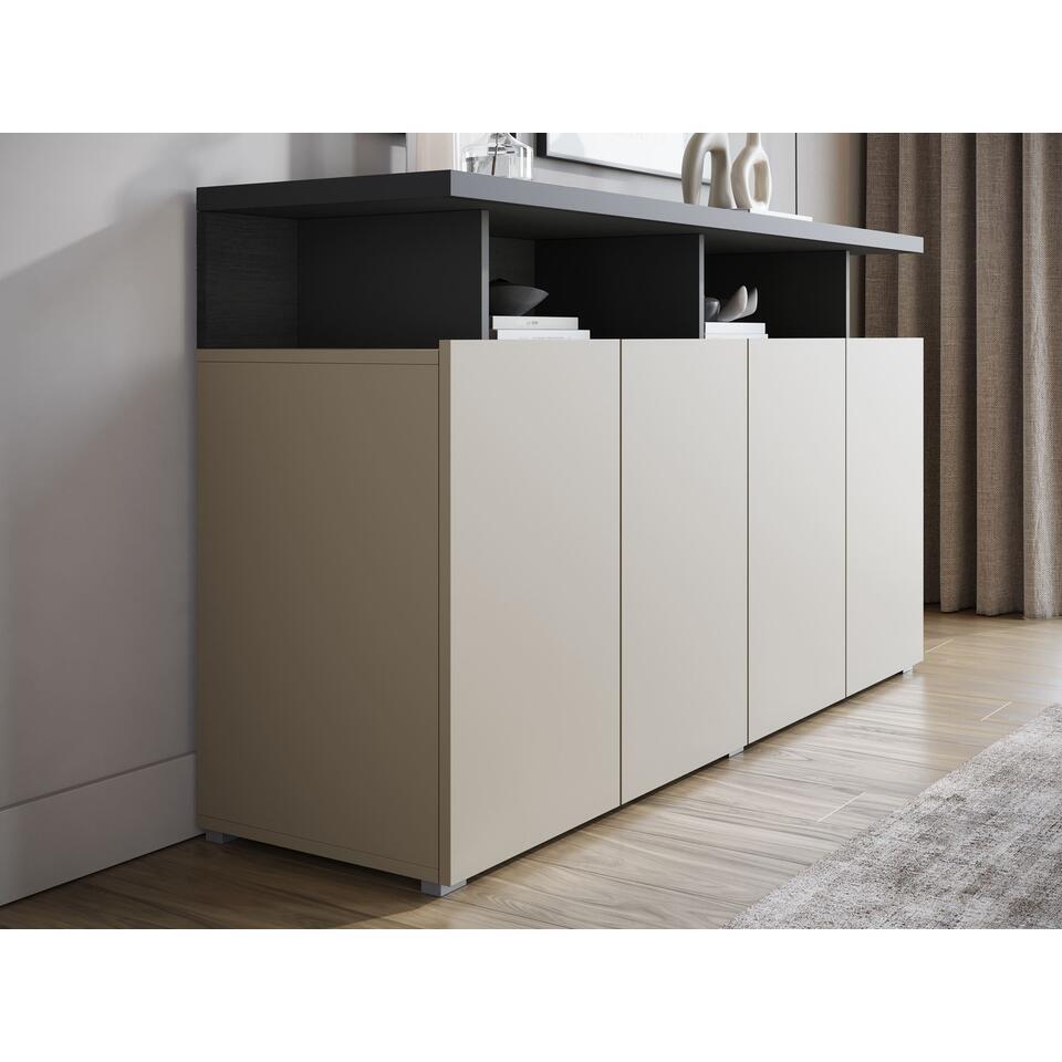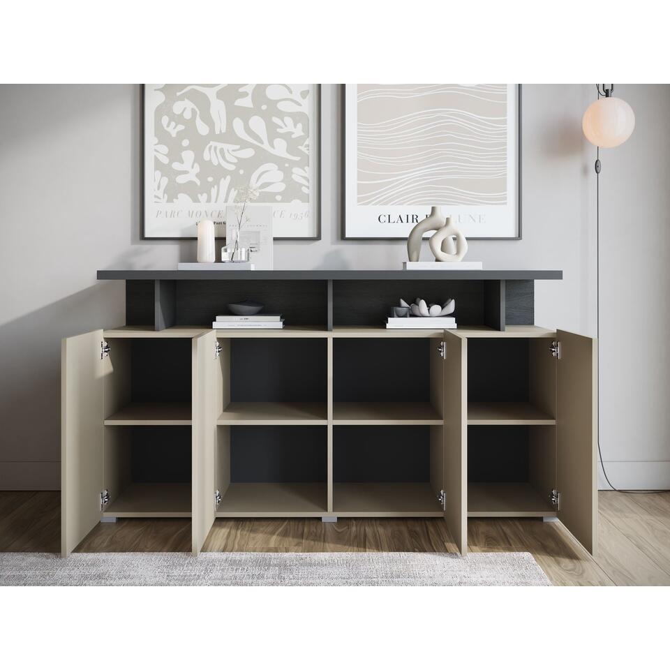 Le buffet Sekai comporte 4 portes sans poignée derrière lesquelles se trouvent 8 compartiments de rangement. Au-dessus des portes, il y a 4 compartiments ouverts. Le meuble est disponible en beige avec des panneaux arrière en chêne anthracite et noir. L'armoire a un aspect moderne. Dimensions : 153x40x84 cm.