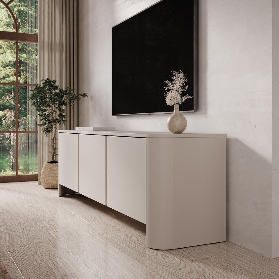 Le meuble TV Barbados est un meuble TV moderne de couleur beige. Il est doté de 3 portes qui s'ouvrent grâce au système « push to open ». Derrière celles-ci se trouvent 3 compartiments de rangement. Les angles arrondis du meuble lui confèrent un aspect élégant. Dimensions : 168x39x52 cm.