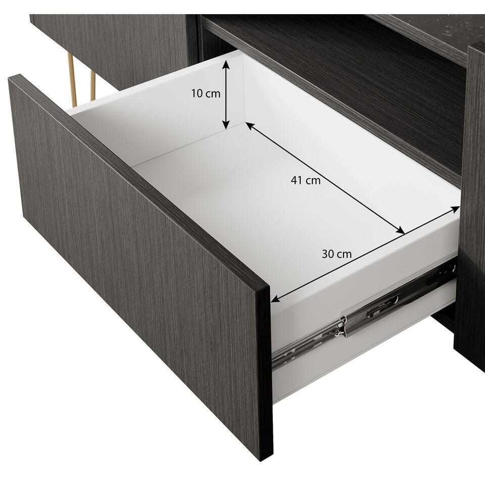 Le meuble TV Hacienda possède 2 portes sans poignée et un tiroir. L'Hacienda repose sur des pieds hauts de couleur dorée et possède un plateau d'aspect marbre. L'armoire est constituée d'une construction robuste en bois mélaminé. Dimensions : 144x37x55 cm.