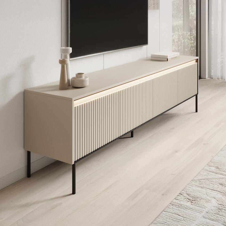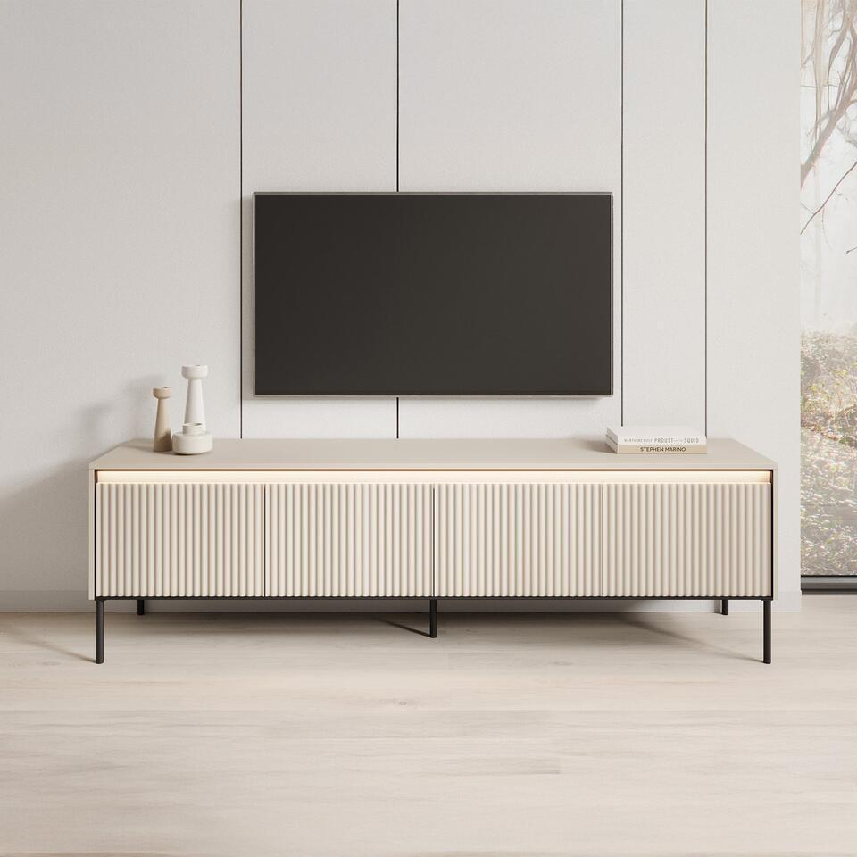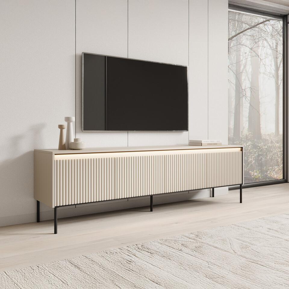 Meuble TV Timoteo est un meuble TV moderne de couleur beige. Le meuble a 4 portes sans poignée qui s'ouvrent par le haut. La façade est ornée d'un motif à lamelles. Le meuble repose sur des pieds noirs. Dimensions : 193x40x56 cm.