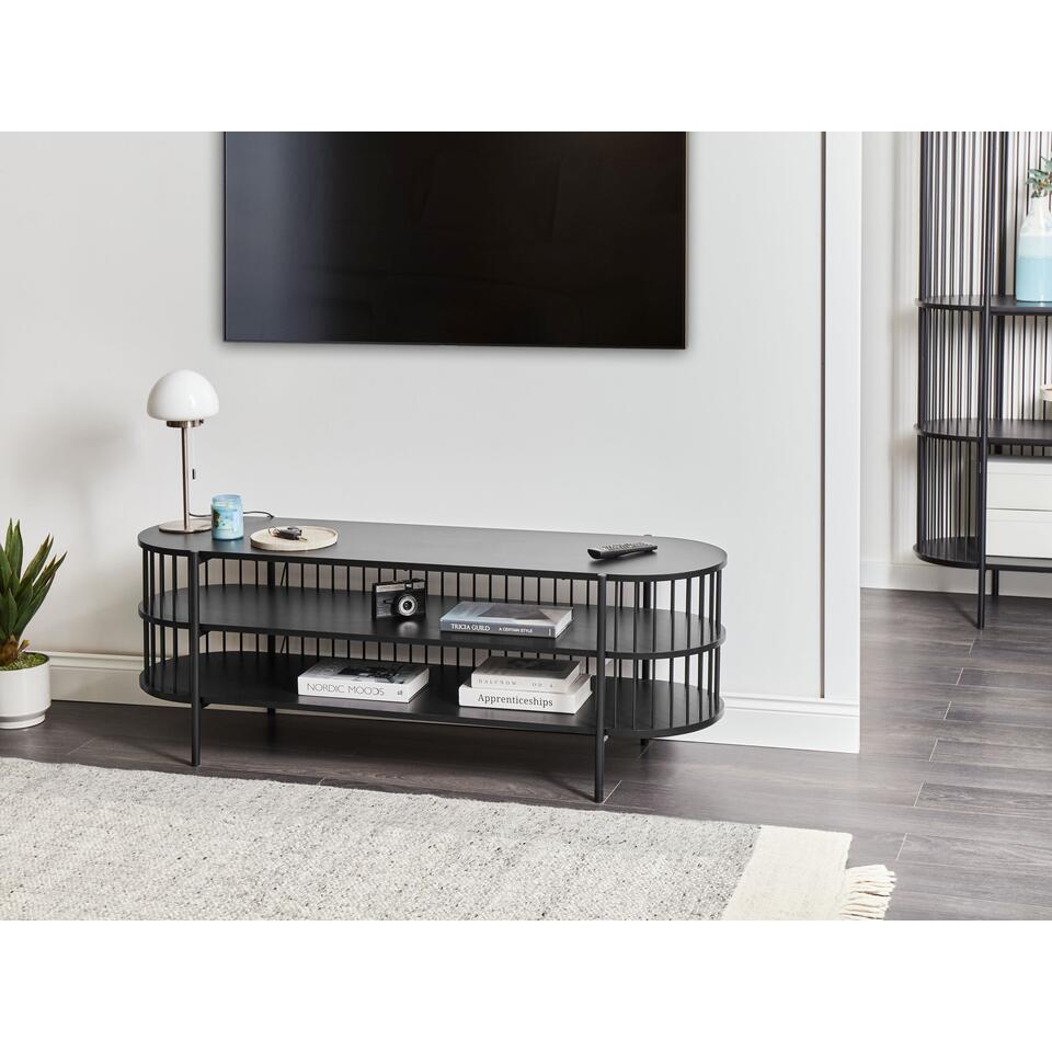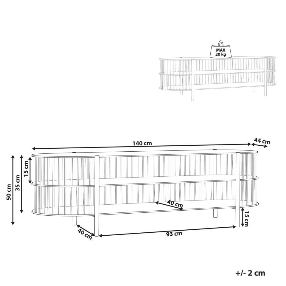 Meuble pour un téléviseur jusqu'à 55ʺ. Ce meuble TV élégant présente un design moderne, avec des lamelles à l'arrière et sur les côtés qui ajoutent une touche de style à votre salon. Doté de deux étagères pratiques en MDF et soutenu par un cadre métallique, il permet de ranger les jeux, les télécommandes ou d'autres accessoires. Ce meuble est un excellent moyen de garder un salon bien organisé, et il s'intègre bien dans n'importe quel décor.