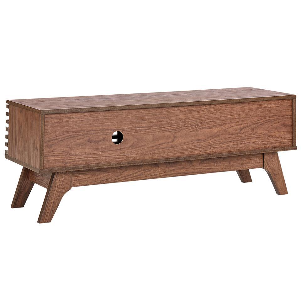 Meuble télé au style rétro avec porte coulissante. Ce superbe meuble TV en MDF de haute qualité s'intégrera parfaitement à la décoration de votre séjour ou votre chambre. Cet espace de rangement au design moderne se compose de 2 grands compartiments de rangement avec étagères réglables et d'une porte coulissante ajourée. Idéal pour placer vos équipements TV comme lecteurs DVD, décodeurs ou autres. Ce meuble élégant est fabriqué à partir de panneau de particules à l'effet bois foncé.