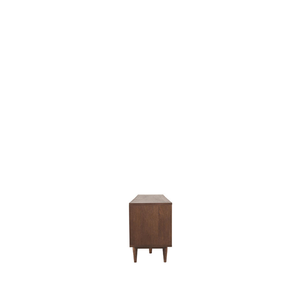 Les fines rainures des portes et des tiroirs du meuble TV accentuent subtilement le caractère ludique. Le meuble TV est divisé en trois parties dont les deux parties extérieures sont fermées par une porte coulissante. La partie centrale dispose de deux tiroirs spacieux, où vous pourrez facilement ranger vos affaires. Les pieds en forme de cône donnent au meuble un aspect aérien.