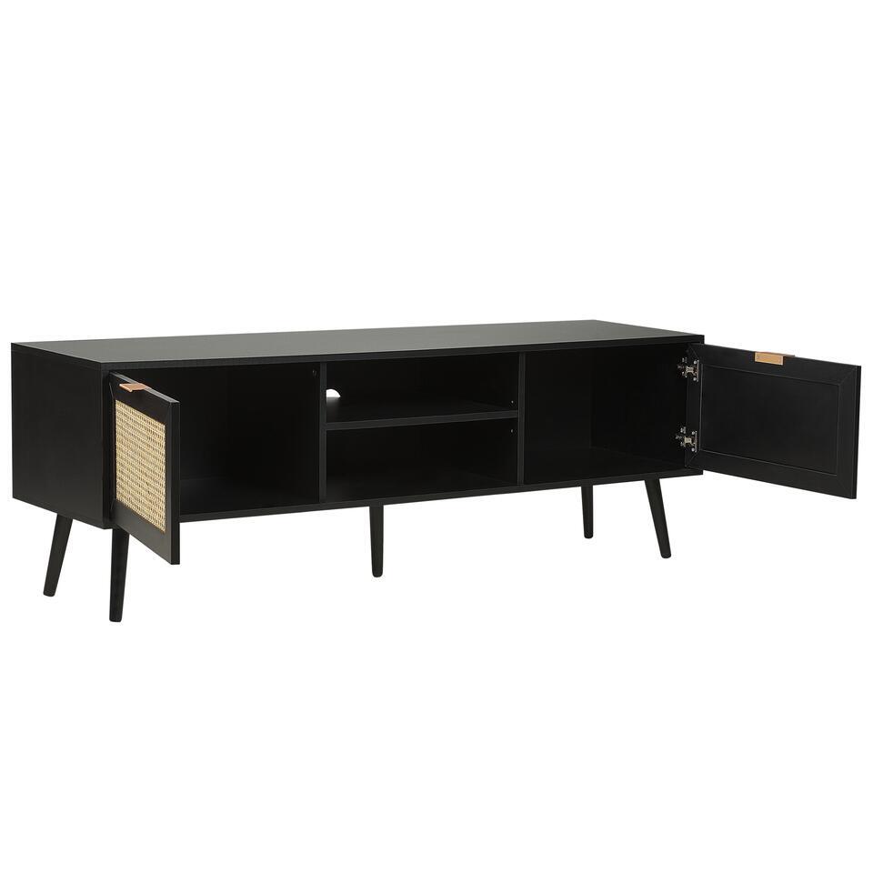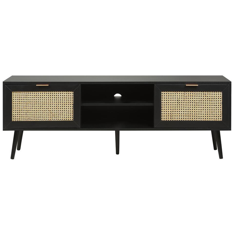 Meuble de rangement TV avec façades en rotin. Ce meuble TV est l'accessoire idéal pour compléter l'aménagement de votre salon. Il est doté de deux armoires spacieuses, offrant un vaste espace de rangement pour vos accessoires de divertissement tout en conservant une apparence élégante. Les étagères ouvertes offrent un espace d'exposition parfait pour vos appareils multimédia ou vos objets décoratifs et une fente discrète pour les câbles permet de les ranger à l'abri des regards. Soutenu par de robustes pieds en bois de caoutchouc et orné d'élégantes poignées dorées, ce meuble allie parfaitement le style et la fonctionnalité et s'intègre parfaitement à tout décor de salon.