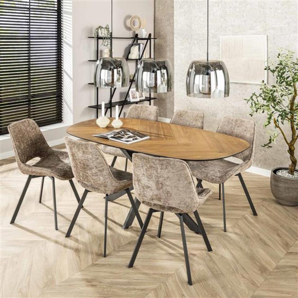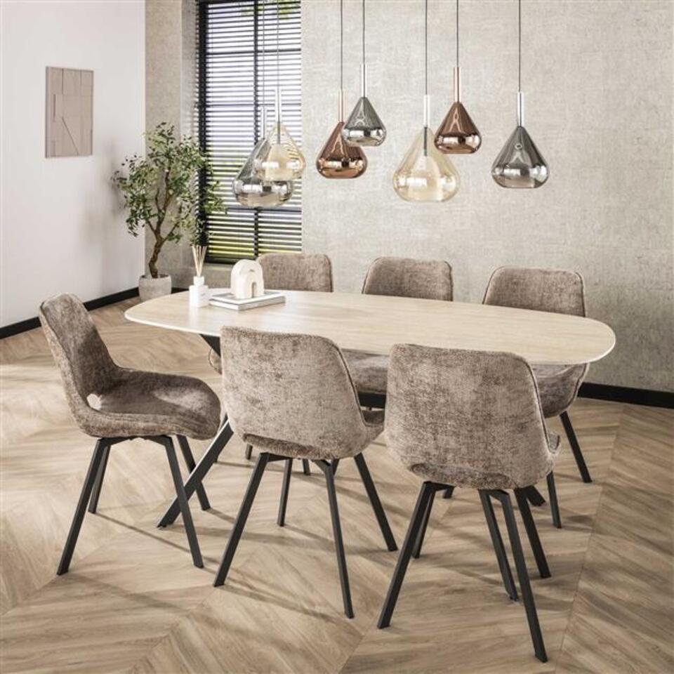 La chaise de salle à manger pivotante allie confort, fonctionnalité et style. L'assise est recouverte d'un tissu chenille à tissage grossier d'un beige doux, lui conférant un aspect chaleureux et moderne. Le piètement en acier thermolaqué anthracite offre un contraste élégant et garantit une grande stabilité.