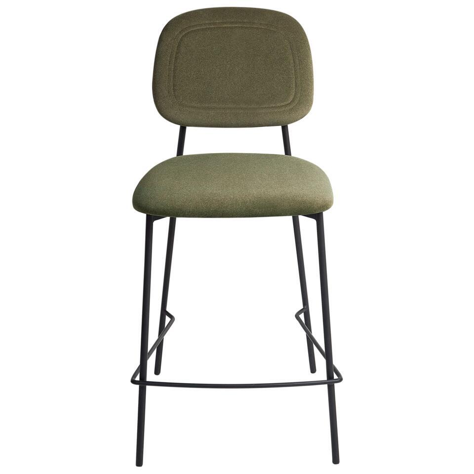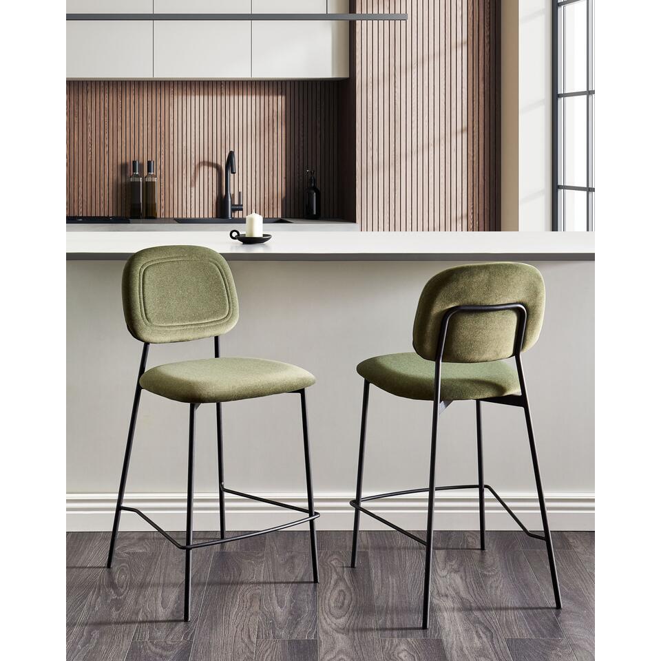 Lot de 2 tabourets de bar rembourrés. Ce tabouret de bar élégant apporte une touche de fraîcheur et de modernité à votre espace. Avec son doux revêtement en velours vert olive et ses solides pieds noirs, il apporte à la fois confort et style contemporain à votre intérieur. Parfait pour ajouter une option d'assise chic à votre bar de petit-déjeuner ou à votre îlot de cuisine.