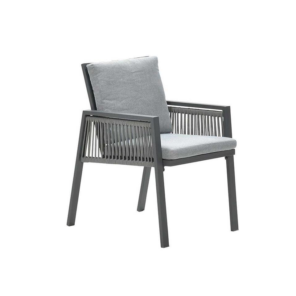 La chaise longue de salle à manger est constituée d'un cadre en aluminium résistant aux intempéries et sans entretien. Le cadre est recouvert d'un revêtement en poudre gris foncé robuste. Cela garantit que le cadre dispose d'une couche de protection contre les rayures et les chocs. Ce cadre a une belle finition de corde textilène. Cette corde a un diamètre de 8 mm et est de couleur gris argenté. Avec les coussins inclus, cela donne à la chaise de salle à manger une belle apparence.