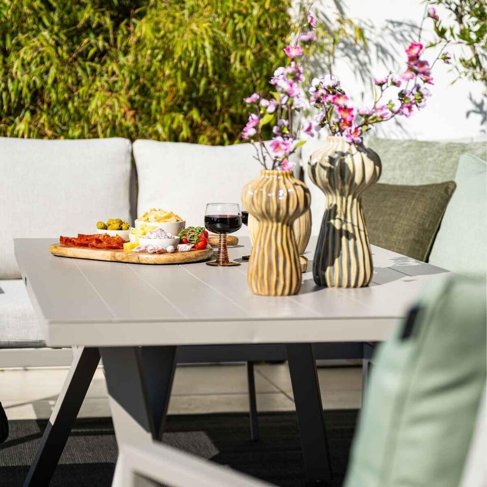 Cet ensemble de salle à manger de salon se compose de deux canapés pour trois personnes et d'une table de salle à manger de salon. Si vous avez besoin de sièges supplémentaires, vous pouvez compléter cet ensemble avec la chaise de jardin Senja ou le banc de jardin de la marque Garden Impressions. De cette façon, vous pouvez facilement créer un espace supplémentaire pour les invités. De plus, l'ensemble salon-salle à manger est disponible dans une configuration à droite et à gauche, afin que vous puissiez choisir ce qui convient le mieux à votre espace extérieur.
