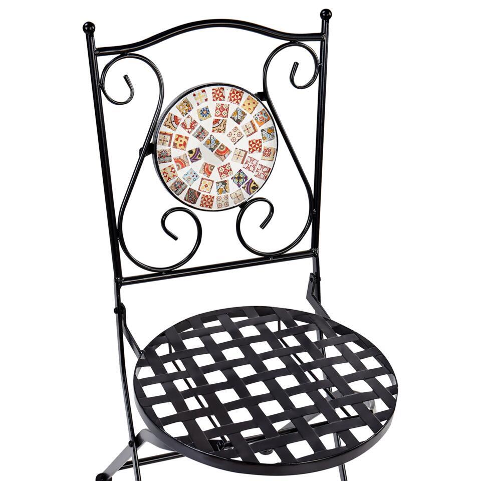 Chaises pliantes avec motif mosaïque. Ajoutez une touche de charme méditerranéen à votre espace extérieur avec cet exquis ensemble de deux chaises de bistrot de jardin. Ces pièces pliables sont fabriquées en métal robuste et présentent un superbe effet de mosaïque sur le dossier, composé de carreaux aux couleurs vives. Parfaites pour créer une atmosphère intime et accueillante, leur design rétro apporte une touche unique et artistique à n'importe quel patio ou jardin. La fonction pliable assure un rangement et un transport faciles, tandis que les embouts des pieds protègent vos surfaces contre les rayures, alliant l'attrait esthétique à la fonctionnalité pratique.