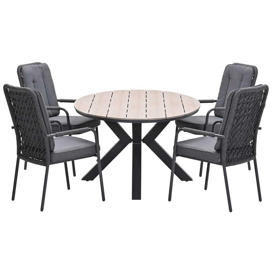 Ce bel ensemble de jardin se compose d'une table de jardin avec plateau en bois de viron et de quatre chaises de jardin confortables. La table de jardin nécessite peu d'entretien et les chaises de jardin sont fournies avec des coussins déperlants. Un joli jardin dans lequel vous pourrez dîner et vous détendre.
