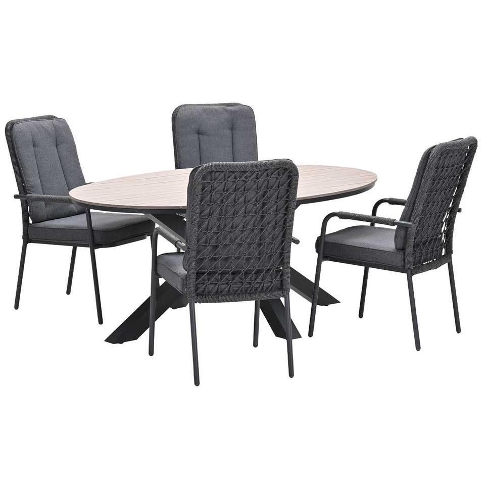 La table de jardin a une forme ovale avec des dimensions : 180 x 115 x 75 cm. Le plateau de table a un plateau en bois de viron en teck clair. La chaise de jardin Aleria a une hauteur de 101 cm. La longueur de la chaise de jardin est de 56,5 sur 74 cm de largeur.