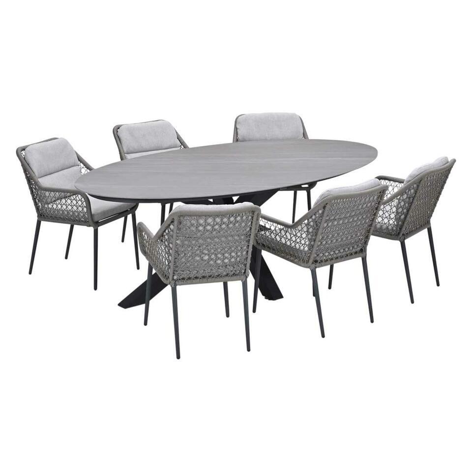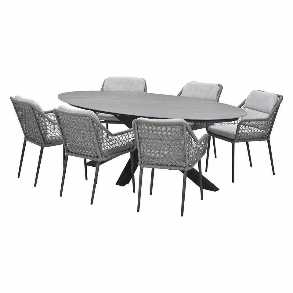 La table de jardin a une forme ovale avec des dimensions : 230 x 115 x 76 cm. Le plateau de la table est de couleur sable de Naples. La chaise de jardin Pemba a un dossier haut et mesure 83 cm de hauteur. La longueur de la chaise de jardin est de 59,5 sur 63 cm de largeur.