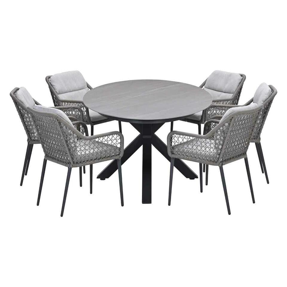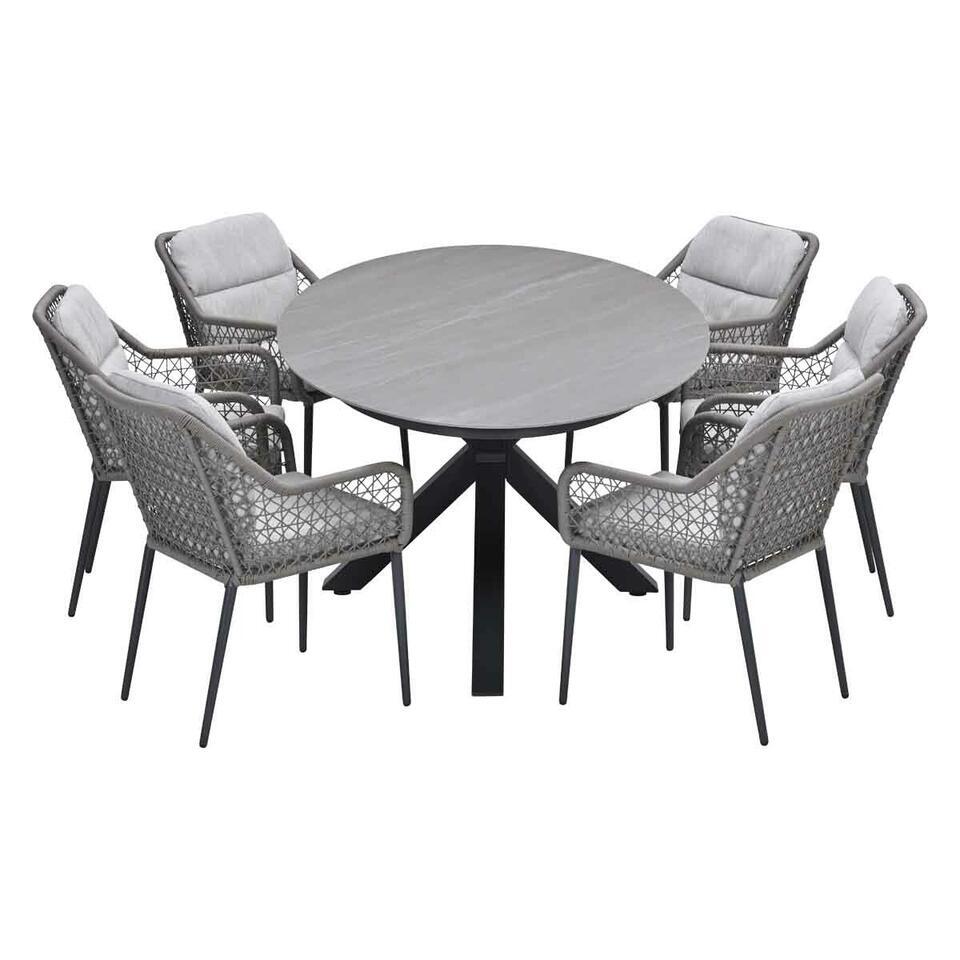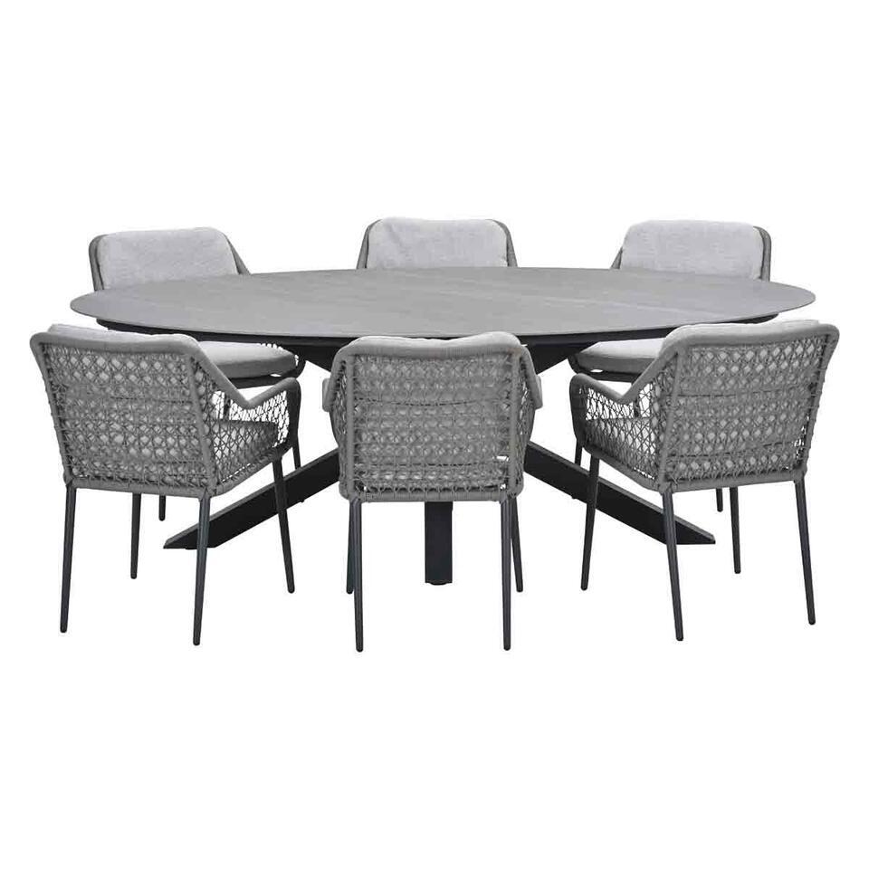 Ce bel ensemble de jardin se compose d'une table de jardin avec plateau en centostone et de six chaises de jardin confortables. La table de jardin nécessite peu d'entretien et les chaises de jardin sont fournies avec des coussins déperlants. Un joli jardin dans lequel vous pourrez dîner et vous détendre.