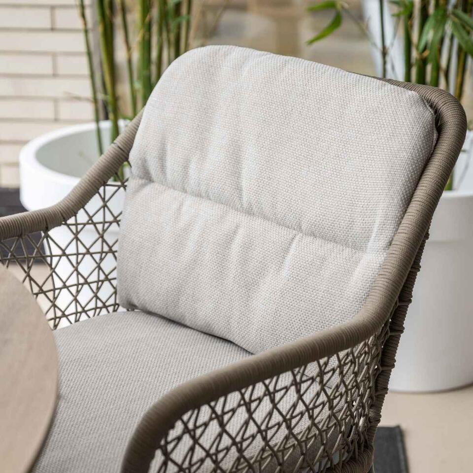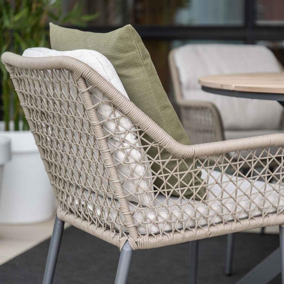 La chaise de jardin Pemba est composée d'un cadre en aluminium sans entretien avec un revêtement en poudre robuste. Ce cadre en aluminium est enveloppé d'une corde de couleur gris foncé de haute qualité. Cette corde peut être comparée à la corde utilisée dans le transport maritime. La corde a un noyau en caoutchouc à l'intérieur contenant plusieurs fils de polyester pour plus de résistance. Le noyau en caoutchouc est entouré d'une corde en polyester teinte dans la masse. Cela signifie que la corde est entièrement colorée et se décolore beaucoup moins rapidement.