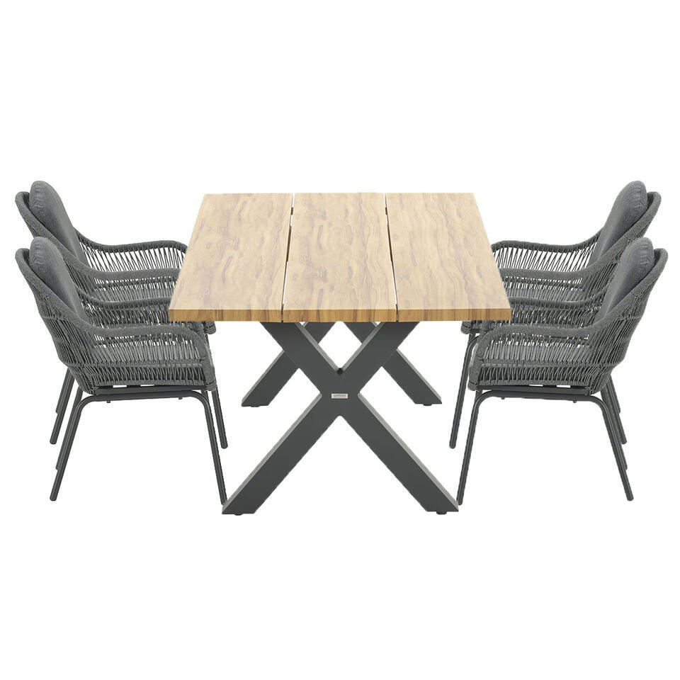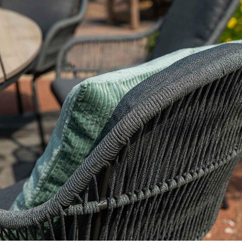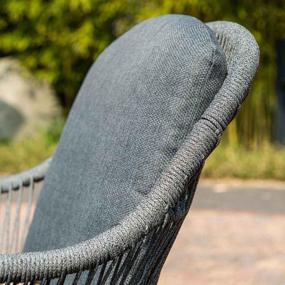 La chaise de jardin Yima est composée d'un cadre en aluminium sans entretien avec un revêtement en poudre robuste. Ce cadre en aluminium est enveloppé d'une corde de couleur gris clair de haute qualité de 5 mm d'épaisseur. Cette corde peut être comparée à la corde utilisée dans le transport maritime. La corde a un noyau en caoutchouc à l'intérieur contenant plusieurs fils de polyester pour plus de résistance. Le noyau en caoutchouc est entouré d'une corde en polyester teinte dans la masse. Cela signifie que la corde est entièrement colorée et se décolore beaucoup moins rapidement. Les coussins épais inclus sont en polyester de haute qualité. Les coussins ont une fermeture éclair, ce qui rend les housses faciles à laver à la main. Les coussins ne sont pas résistants à l'eau et peuvent être rangés dans l'abri ou dans une boîte à coussins après utilisation. Les coussins ont un revêtement hydrofuge. Ceci est particulièrement pratique si, par exemple, une boisson est renversée sur l'oreiller. Vous pouvez facilement essuyer à nouveau l'humidité. La table de jardin Zadar de la marque de qualité Garden Impressions est composée d'un cadre en aluminium sans entretien et résistant aux intempéries avec un revêtement en poudre gris foncé robuste. Cette couche garantit que le cadre est résistant aux rayures et aux chocs. Le plateau de la table a un aspect teck, mais est simplement en aluminium. Cela donne à la table de jardin un aspect unique et est facile à essuyer avec un chiffon.