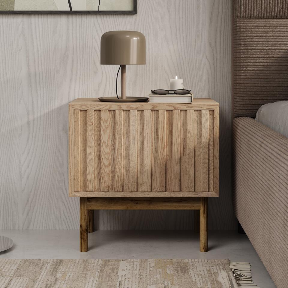 La table de chevet Storm possède 1 porte avec un motif à lattes en façade. La porte est sans poignée et s'ouvre avec un système push to open. La table de chevet repose sur des pieds hauts. Dimensions : 53x36x53cm.