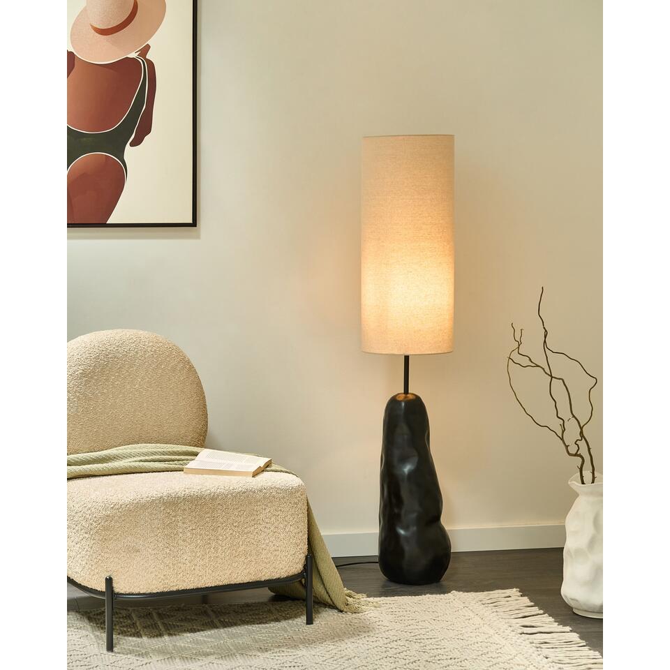 Lampadaire haut avec abat-jour en tissu. Ce lampadaire de style organique apporte une touche artistique à tout espace de vie, grâce à sa base sculpturale en céramique qui lui confère un caractère unique. Son abat-jour haut en tissu peut être incliné sur le côté, ce qui vous permet d'ajuster la lumière exactement là où vous en avez besoin. Parfait pour ceux qui apprécient l'art subtil combiné à un design pratique, ce lampadaire s'intègre sans effort dans un intérieur contemporain et élégant.
