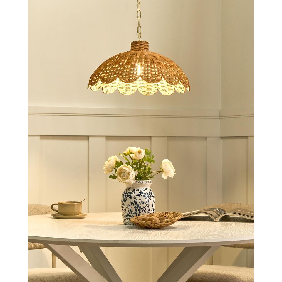Lampe suspendue tissée et festonnée. Une lampe suspendue au charme rétro irrésistible qui s'impose sur n'importe quel plafond. L'abat-jour, fabriqué à la main et doté d'un bord festonné décoratif, est magnifiquement complété par le raccord doré. Qu'elle soit suspendue au-dessus d'une table à manger, dans la cuisine ou dans le salon, elle apporte instantanément une touche chaleureuse et accueillante à l'espace.