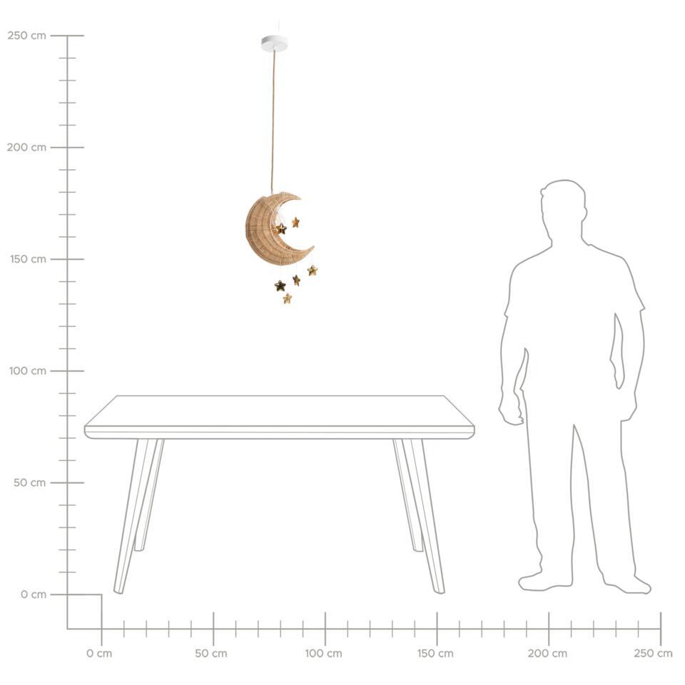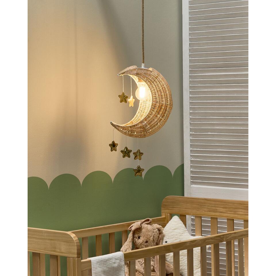 Luminaire suspendu en forme de croissant lune. Transformez la chambre de votre enfant en un paradis nocturne grâce à cette adorable lampe suspendue de style boho. L'abat-jour tressé à la main est en forme de croissant de lune avec de délicates étoiles qui pendent doucement en dessous. La lampe fournit une lumière douce qui crée une ambiance sereine et magique, idéale pour raconter des histoires à l'heure du coucher.
