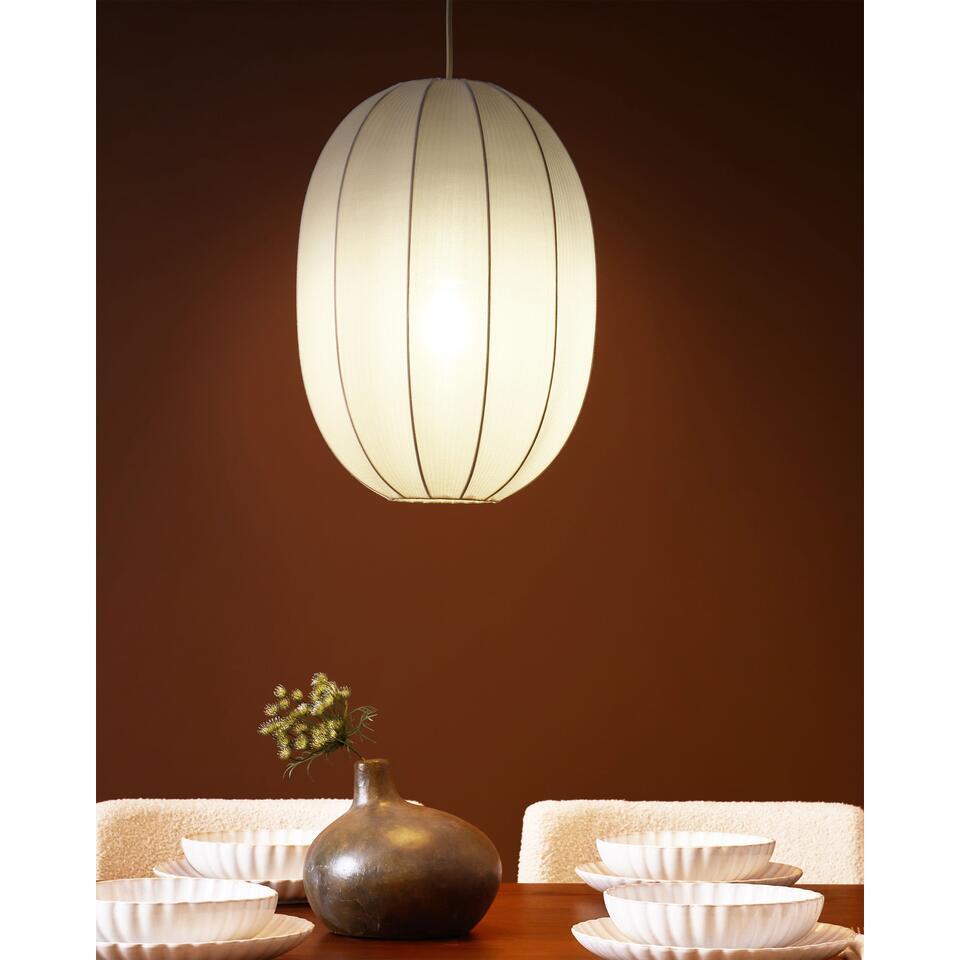 Lampe pendante avec abat-jour en nylon. Sublimez votre espace grâce à l'élégance intemporelle de cette lampe suspendue. Son abat-jour ovale allongé en nylon, orné de plis délicats, dégage un charme sophistiqué et aérien. Conçu pour diffuser la lumière de manière homogène, il crée une atmosphère sereine et accueillante, parfaite pour les salles à manger ou les espaces de vie. Ses lignes épurées et son design minimaliste en font un choix polyvalent pour les intérieurs modernes et classiques, garantissant une intégration parfaite dans votre décor.