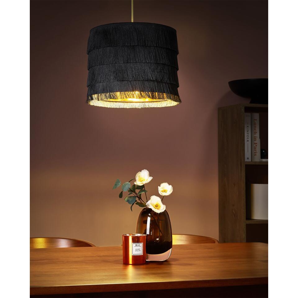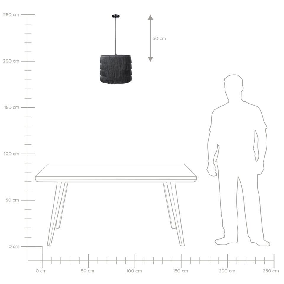 Lampe pendante avec abat-jour à franges. Ajoutez une touche d'élégance bohème à votre intérieur avec cette lampe suspendue qui attire l'attention. L'abat-jour est joliment orné de franges en tissu polyester souple, créant un aspect dynamique et texturé qui rehausse n'importe quelle pièce. Les tons riches et chauds des franges se marient à merveille avec la douce lueur de la lampe, créant une ambiance chaleureuse et accueillante. Parfaite pour les salles à manger, les espaces de vie ou les chambres à coucher, cette lampe est à la fois fonctionnelle et élégante, ce qui en fait une pièce de choix dans n'importe quel décor.