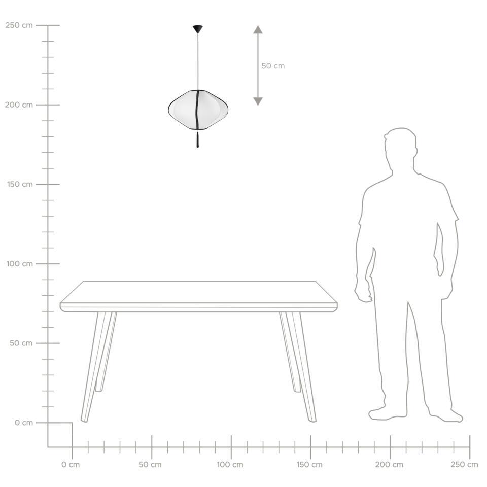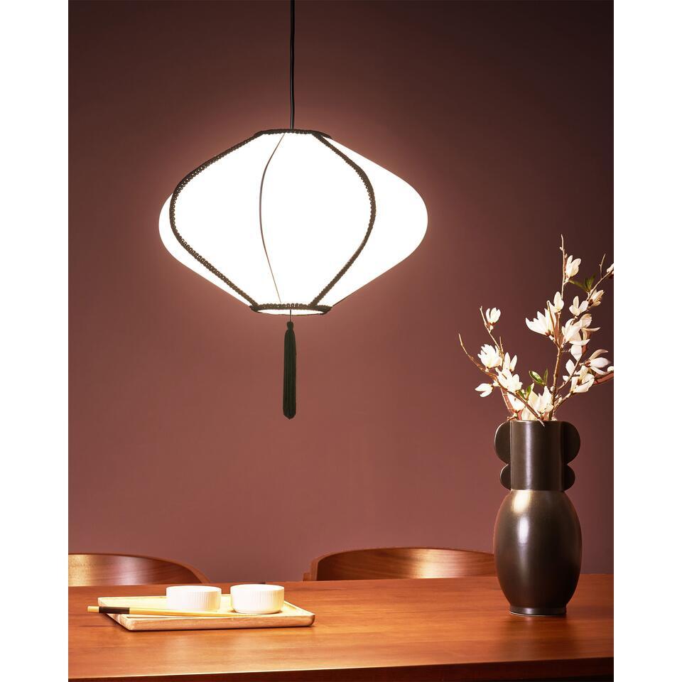 Lampe suspendue avec abat-jour en nylon. Ajoutez une touche d'élégance à votre espace avec cette lampe suspendue magnifiquement fabriquée. L'abat-jour en nylon doux avec une délicate bordure noire crée un look sophistiqué et aéré, tandis que le détail du pompon ajoute une touche ludique mais raffinée. Idéale pour les salles à manger ou les salons, cette lampe offre une lueur chaude et accueillante, ce qui en fait une pièce d'apparat parfaite pour n'importe quelle pièce.