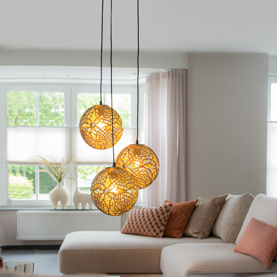 Optez pour une suspension d’ambiance avec notre Maro! Cette lampe arbore une élégante finition dorée, et le design de l’abat-jour garantit un effet lumineux original à la maison. Maro complétera parfaitement l’éclairage de votre salon, de votre cuisine ou de votre bureau à domicile! Son diamètre est de 40cm et sa hauteur est réglable, avec un minimum de 59cm et un maximum de 152cm. La plaque de montage a un diamètre de 40cm et une hauteur de 3cm. Chacun des abat-jour a un diamètre et une hauteur de 26cm. Vous pouvez compléter la lampe avec trois ampoules E27 (40W maximum), à commander séparément. Créez une ambiance plus chaleureuse à la maison avec un variateur externe, car cette lampe est compatible avec un variateur (non inclus). Faites briller votre pièce avec notre Maro.