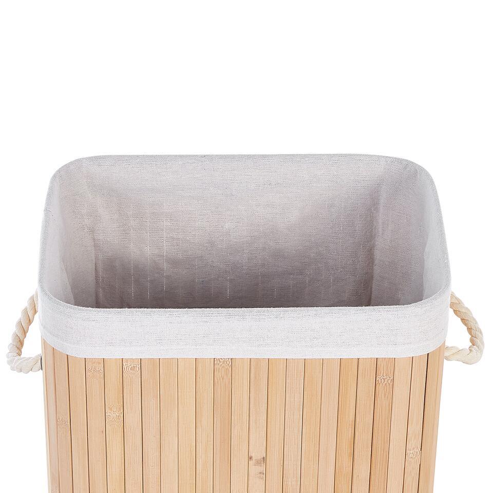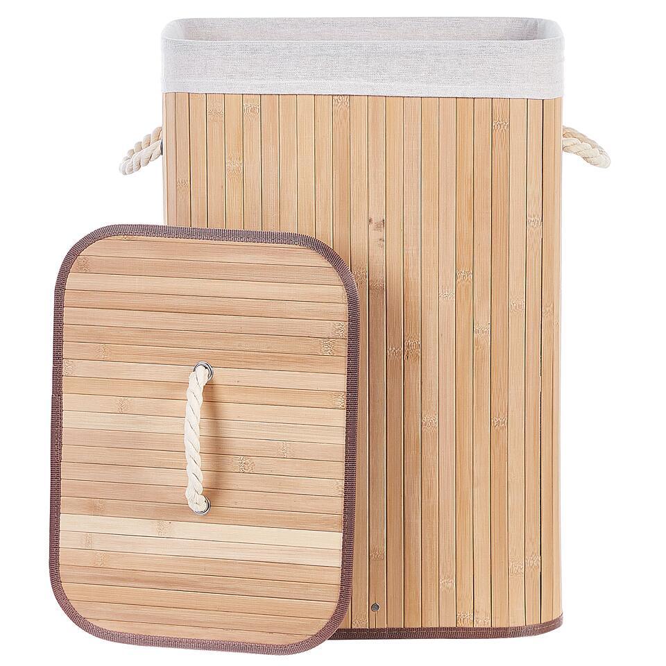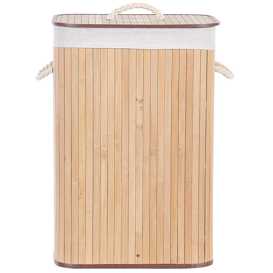 Corbeille à linge avec couvercle. Compact et pratique - c'est ainsi que l'on peut décrire ce panier à linge. Fabriqué en bois de bambou, il se caractérise par une construction solide et un design simple mais esthétique. L'intérieur est rembourré avec un tissu amovible et lavable pour une utilisation hygiénique, tandis que le couvercle et les côtés du panier ont des poignées supplémentaires qui facilitent son transport. Grâce à sa grande capacité, le panier peut être utilisé à la fois pour la lessive et pour ranger vos accessoires.