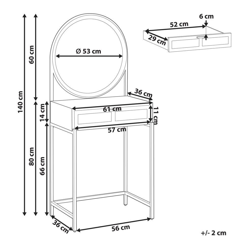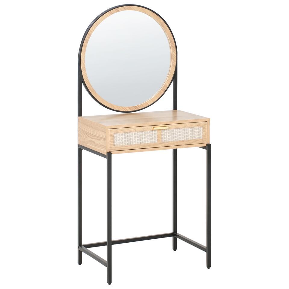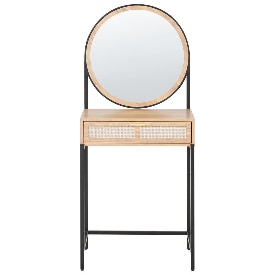 Coiffeuse de style boho. Cette coiffeuse compacte allie un design moderne à une fonctionnalité pratique. Fabriquée en panneaux de particules, elle est dotée d'un tiroir spacieux pour ranger les objets indispensables au quotidien, comme le maquillage, les bijoux ou les accessoires. Le miroir rond et la finition en bois naturel durable ajoutent une touche d'élégance à la chambre ou au couloir. Parfaitement adapté aux petits espaces, le meuble apporte à la fois style et confort à votre quotidien.