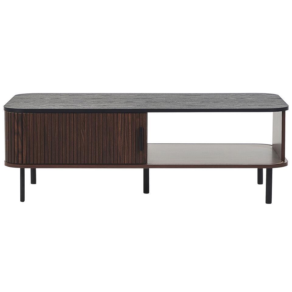 Table basse moderne avec portes coulissantes. Organisez votre espace avec cette table basse, qui comporte deux portes coulissantes. Derrière elles, vous trouverez un grand espace de rangement pour tous vos objets. En outre, la table comporte également deux armoires ouvertes. Le plateau est fait de panneaux de particules et la construction repose sur des pieds en métal, ce qui la rend très stable.