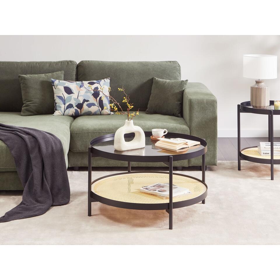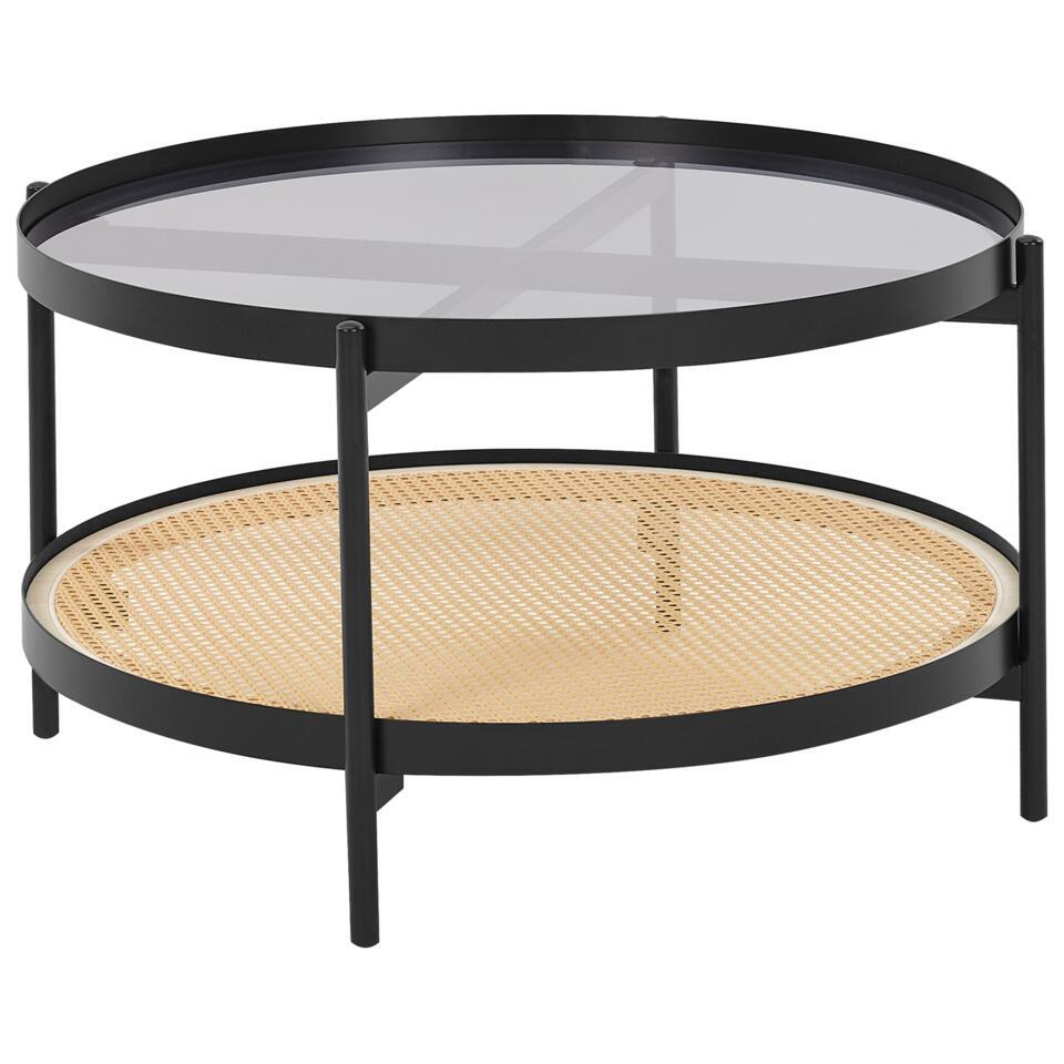 Table basse décorative. Cette élégante table basse ronde allie sans effort un design moderne à des touches naturelles, ce qui en fait une pièce maîtresse remarquable pour tout espace de vie. La structure robuste en métal noir supporte un plateau en verre trempé avec un bord en forme de plateau, offrant une surface élégante et raffinée. En dessous, une étagère fabriquée en rotin PE et ornée de tresses viennoises ajoute de la chaleur et de la texture. Parfaite pour exposer des objets de décoration ou pour garder les objets essentiels à portée de main, cette table basse allie un style intemporel à une fonctionnalité quotidienne.