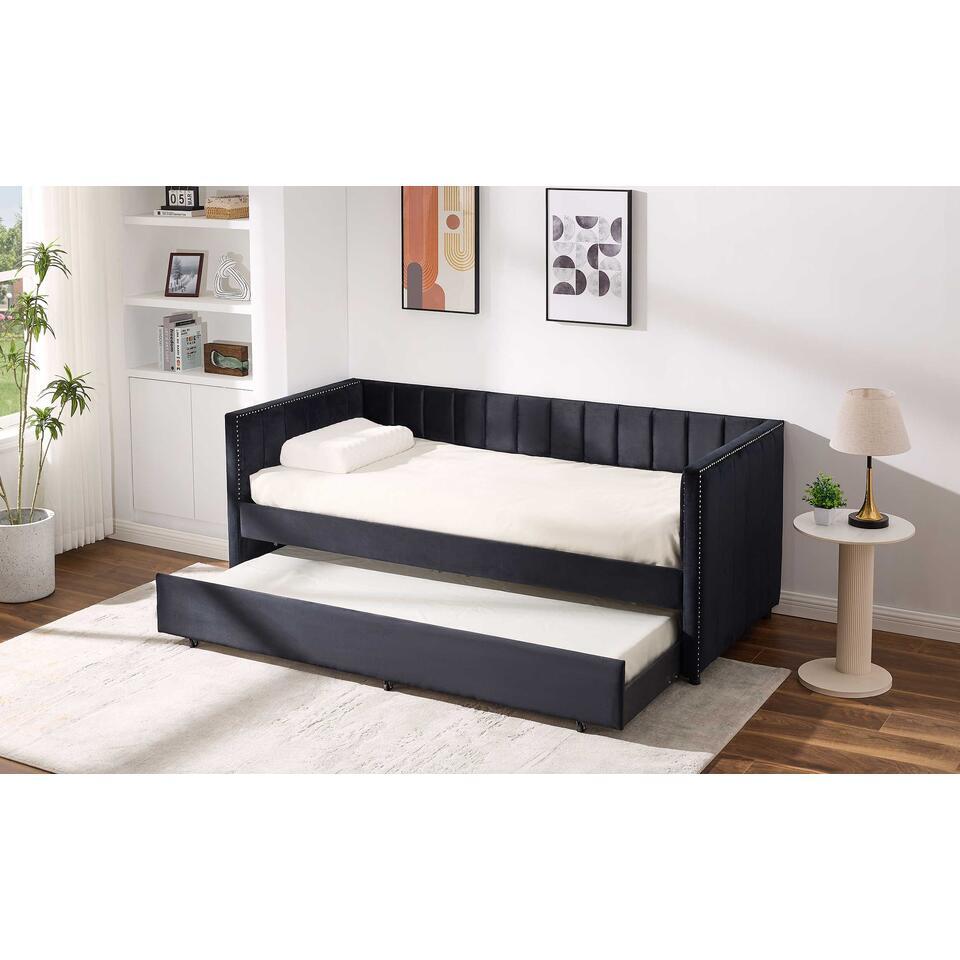 Haal een vleugje luxe en glamour in je slaap-of logeerkamer met het bed Auckland. Het bed is gemaakt uit MDF met een zwarte bekleding. Het ontwerp met de verticale stiksels, de nageltrim en het zwarte velours geven dit bed een elegante en luxueuze uitstraling. Het bed Auckland is uitgerust met een onderschuifbed, waardoor je twee volwaardige slaapplekken hebt. Hierdoor is het bed perfect voor een logeerkamer. Wanneer je het tweede bed niet meer nodig hebt, schuift deze makkelijk onder het bed en neemt deze verder geen plaats in. Beide bedden beschikken over een lattenbodem.