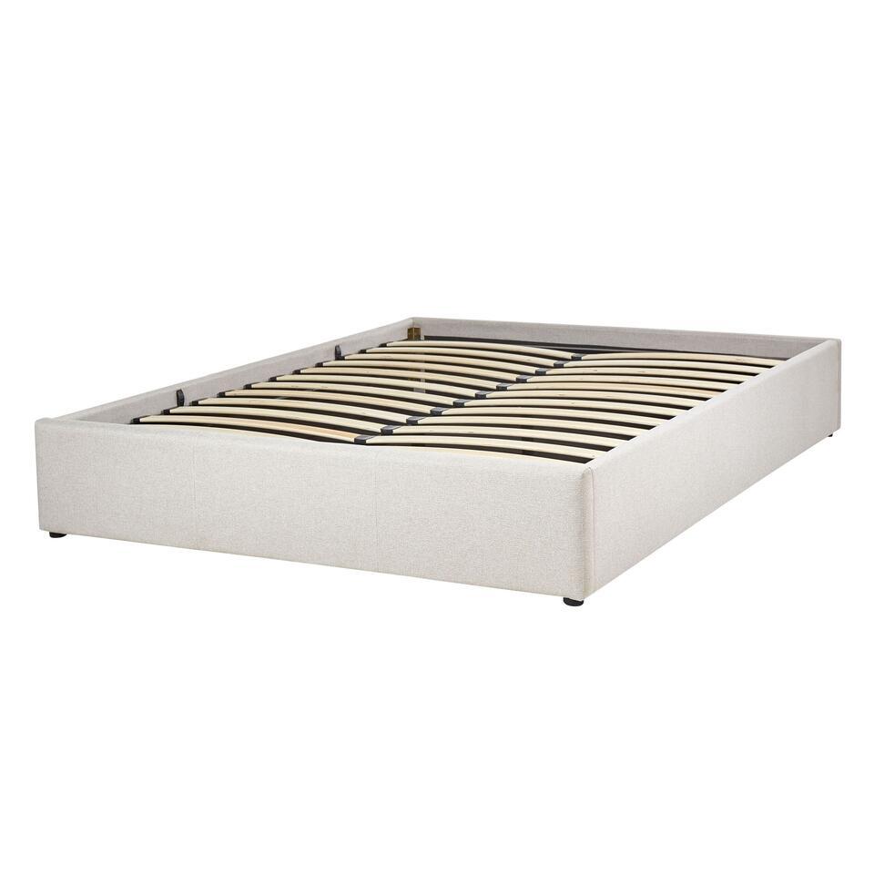 Gestoffeerd bedframe met opbergruimte. Geef je slaapkamer een stijlvolle uitstraling en geniet van de perfecte nachtrust met dit klassieke bedframe. Het bed heeft een zachte en duurzame stoffen bekleding en een lattenbodem die een gelijkmatige verdeling van het lichaamsgewicht garandeert. Dit frame is ook uitgerust met praktische en ruime opbergruimte, die voldoende ruimte biedt voor al je lakens en kussens. Dit bed wordt geleverd in een compact formaat en zonder hoofdbord, waardoor het de ideale oplossing is voor kamers met lage plafonds. Dankzij het klassieke, universele ontwerp past dit bed gemakkelijk in elk traditioneel of modern interieur.