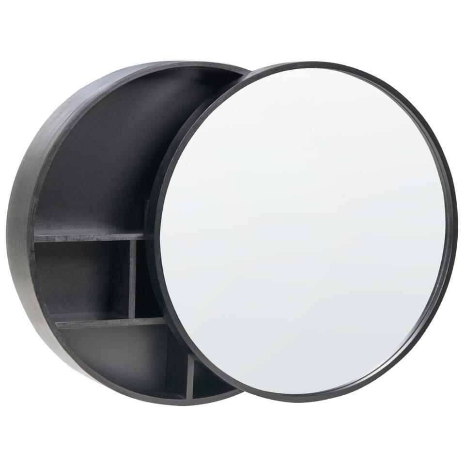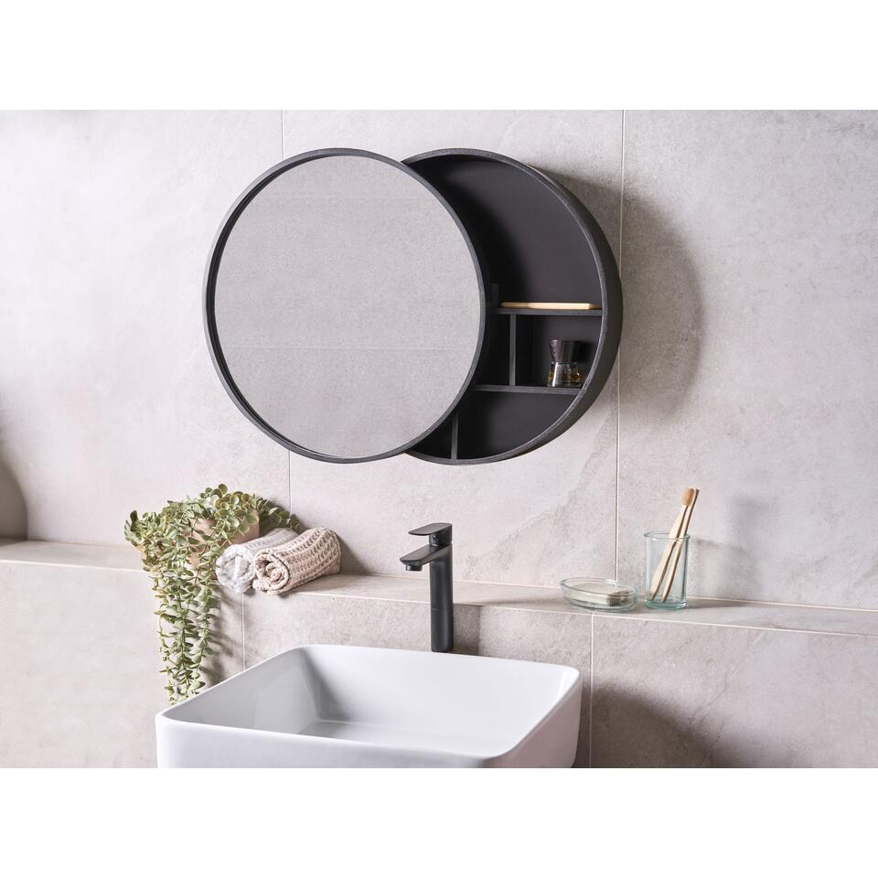Houten ronde badkamerkast met spiegel boven wastafel. Deze ronde badkamerkast met spiegel combineert stijl en functionaliteit. Hij is gemaakt van duurzaam bamboehout en heeft drie binnenvakken voor het opbergen van toiletartikelen en kleine benodigdheden. De schuifdeur met spiegel zorgt voor gemakkelijke toegang en bespaart ruimte, waardoor hij zowel een praktische opbergoplossing als een functionele spiegel is. Deze compacte en moderne kast is perfect voor elk badkamerinterieur.