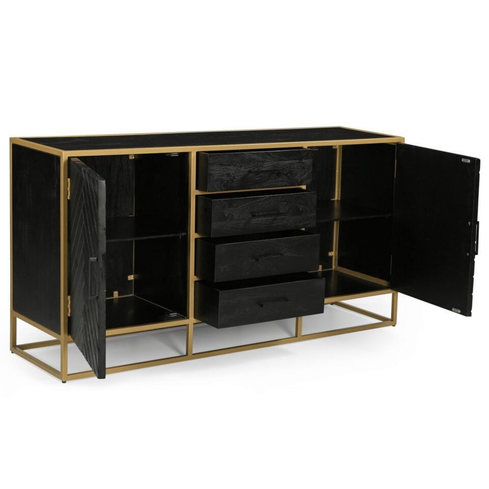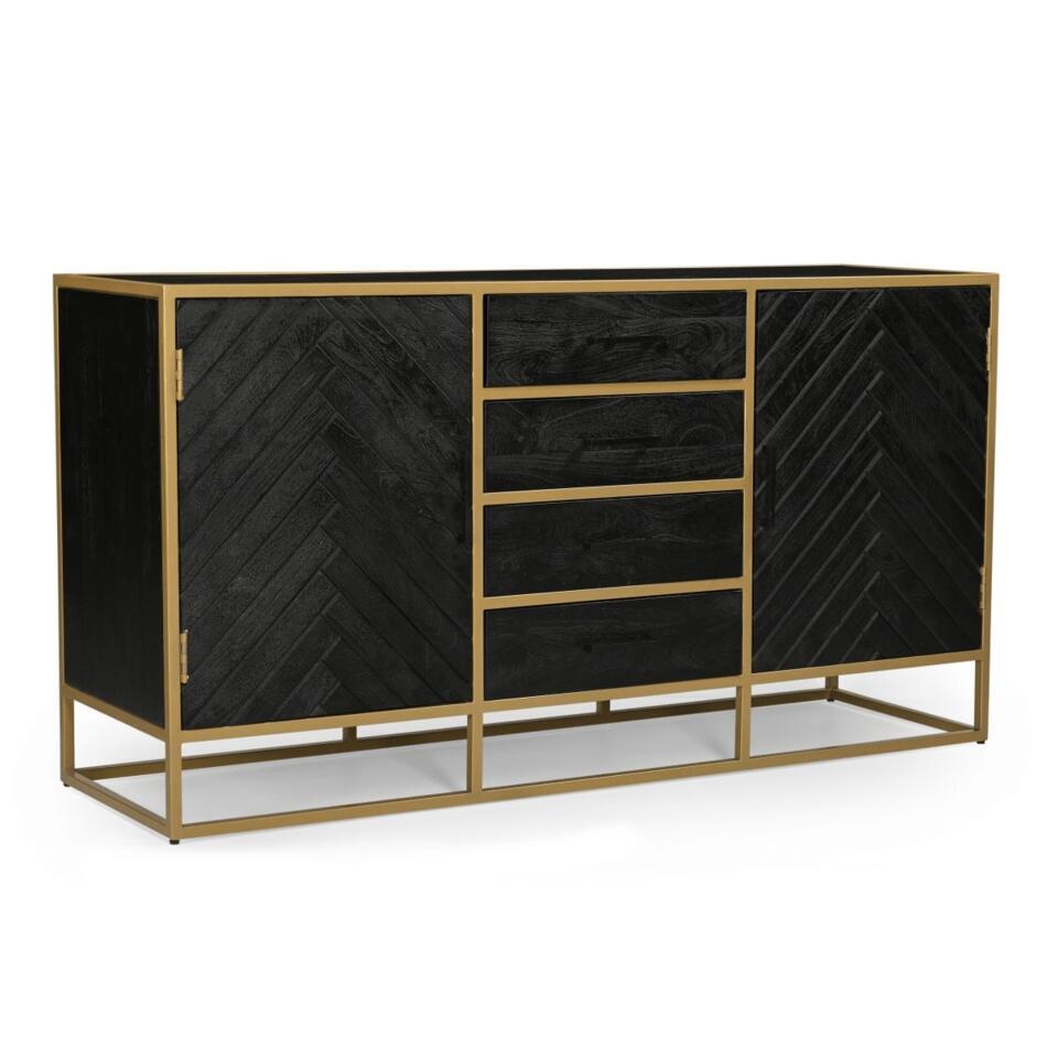 Het mangohout is massief en is eerst gezandstraald, waarna het behandeld wordt met zwarte verfbeits en tenslotte wordt afgewerkt met een donkere, natuurlijke bijenwas om het hout te beschermen tegen vocht, vuiligheid en kringen. Het frame en de handgrepen zijn gemaakt van goudkleurig gepoedercoat metaal.