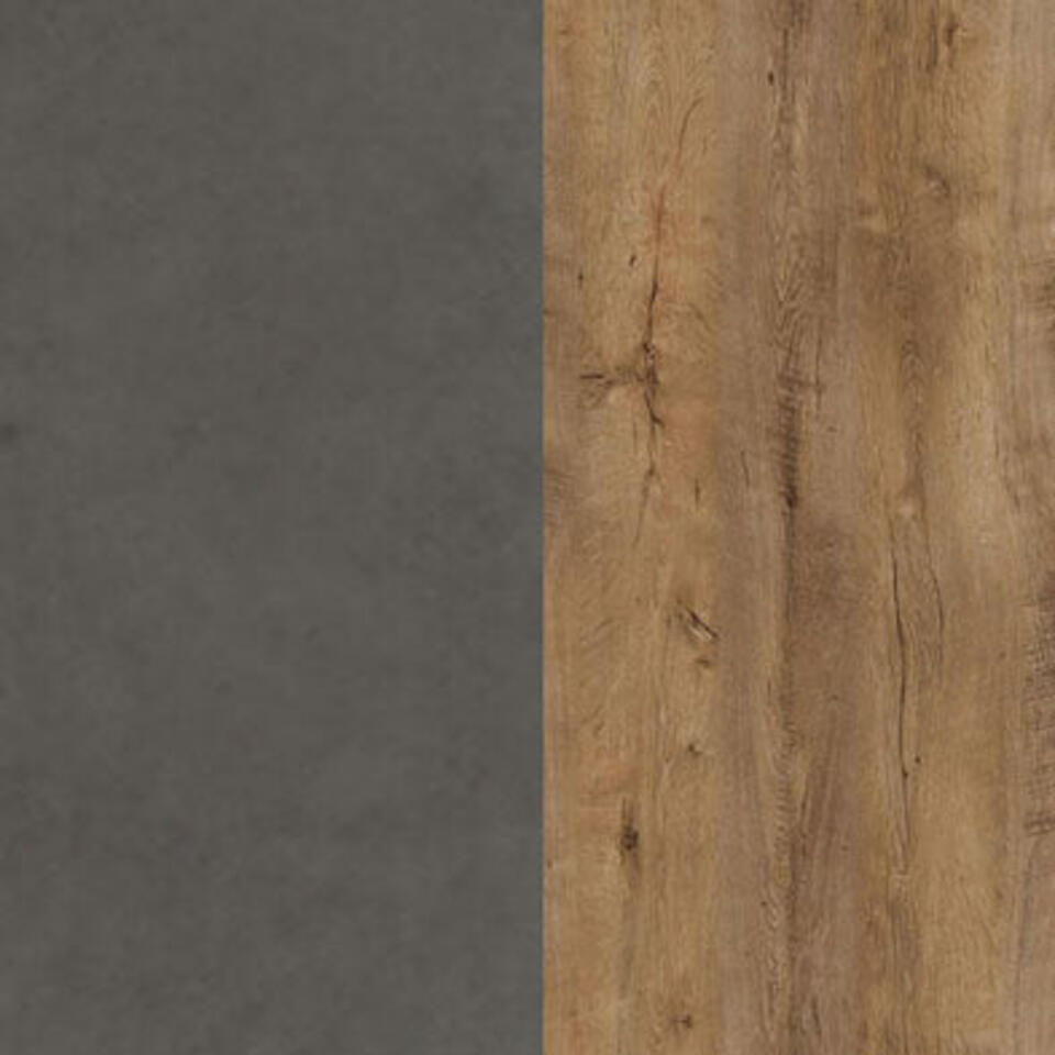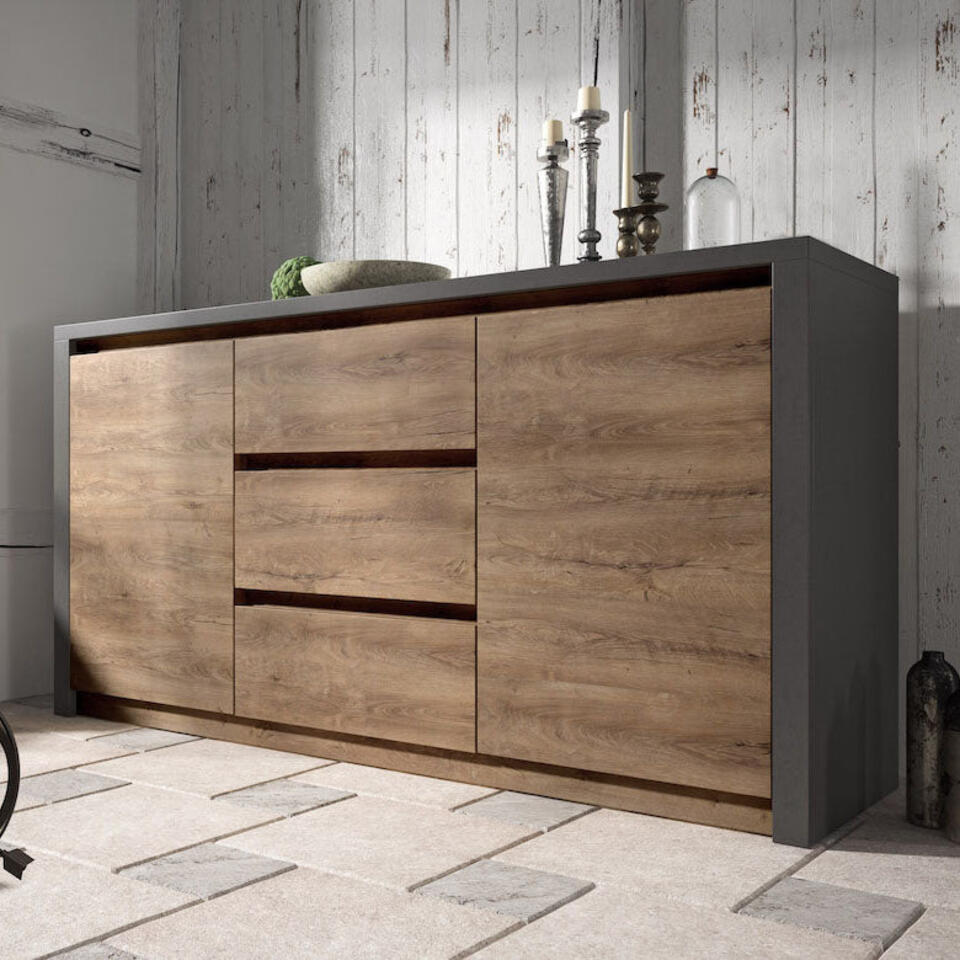 De Monaco is een landelijk dressoir voor in de woonkamer. Het dressoir is uitgevoerd in eiken kleur met mat grijs. De kast heeft twee deuren en 3 greeploze lades. Achter deze deuren zitten twee legplanken, waardoor je twee opbergvakken hebt. Het meubel wordt ongemonteerd geleverd. Je dient het dus met behulp van de bijgeleverde handleiding zelf in elkaar te zetten.