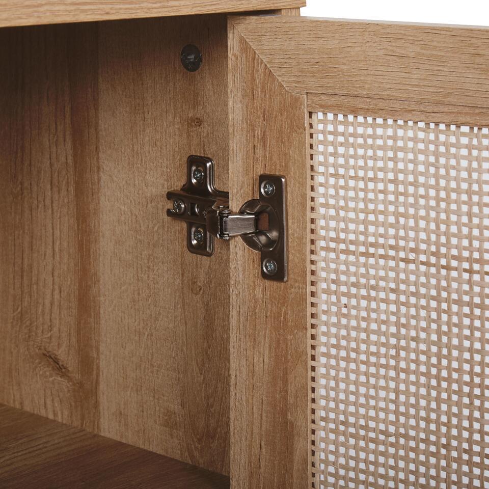 Dressoir met 3 rotan deuren in lichtbruin. Dressoirs hoeven niet langer eenvormig en eentonig te zijn. De natuurlijke rotan deuren van het dressoir vallen op en brengen een grote dosis boho-stijl naar je woon- of slaapkamer. Aarzel niet om decoratie, wat potplanten of boeken op het blad te plaatsen en maak efficiënt gebruik van de ruime kasten eronder. De zwart metalen poten van het dressoir voegen wat kleurcontrast toe en zorgen voor robuustheid en een lange levensduur.