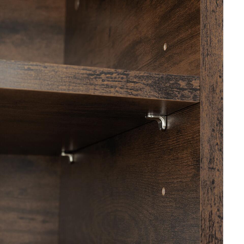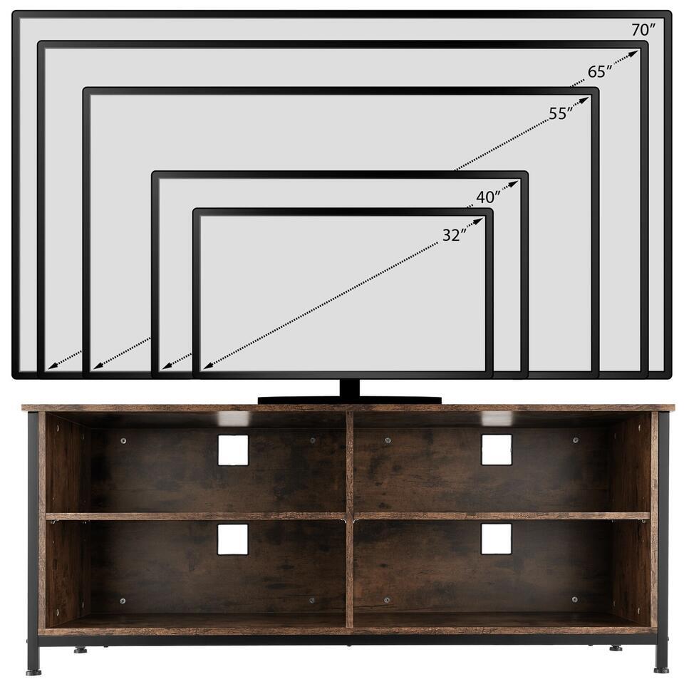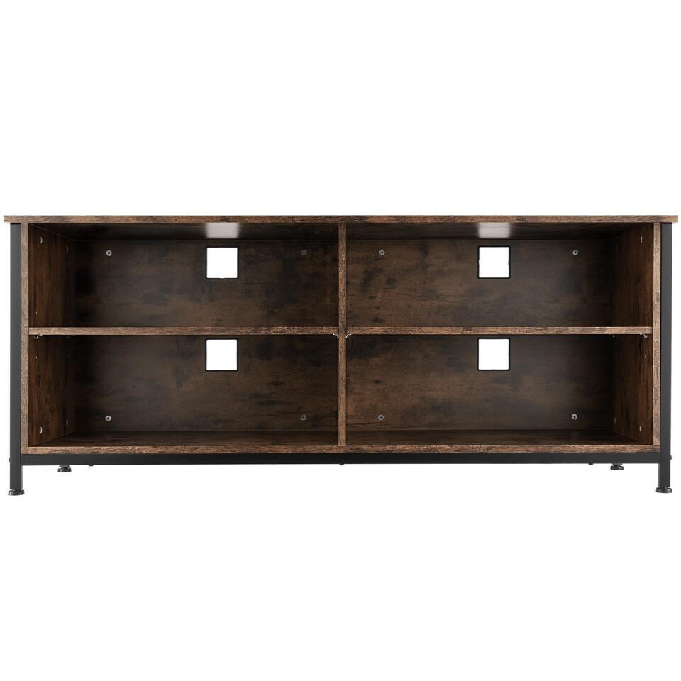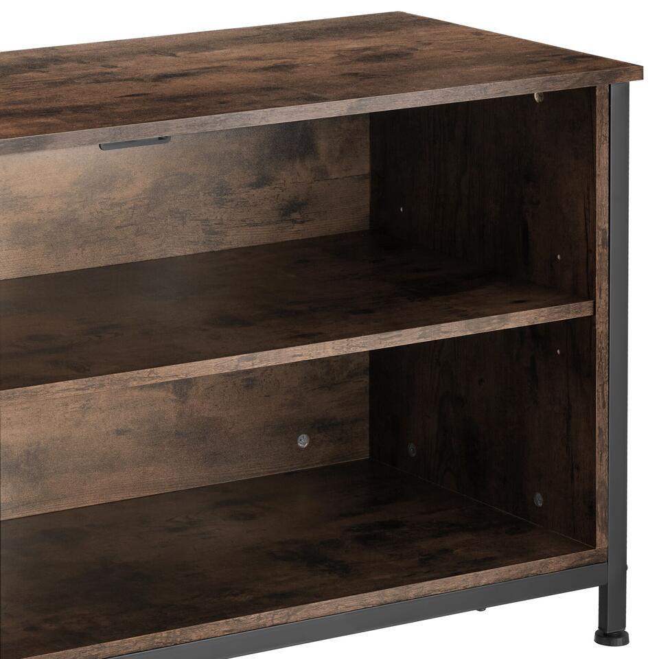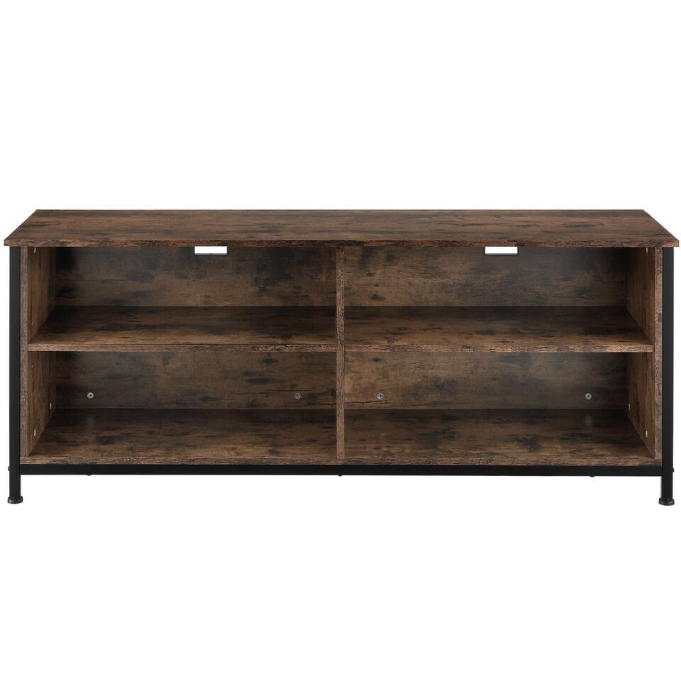 Haal de minimalistische, industriële stijl in huis met het rustieke tv-meubel Navan van tectake. Dit meubel is perfect geschikt voor presentatie van je apparaten en daarbij biedt het veel opbergruimte. De look wordt gekenmerkt door rechte lijnen en het harmonieuze contrast van warm hout en koel staal. Dankzij de twee in hoogte verstelbare planken kan de grootte van de opbergvakken worden ingesteld volgens persoonlijke voorkeuren en behoeften. Vier uitsparingen voor een nette kabelgeleiding en vier vloerbeschermende schroefpoten ronden het profiel van dit functionele en veelzijdige tv-meubel succesvol af.