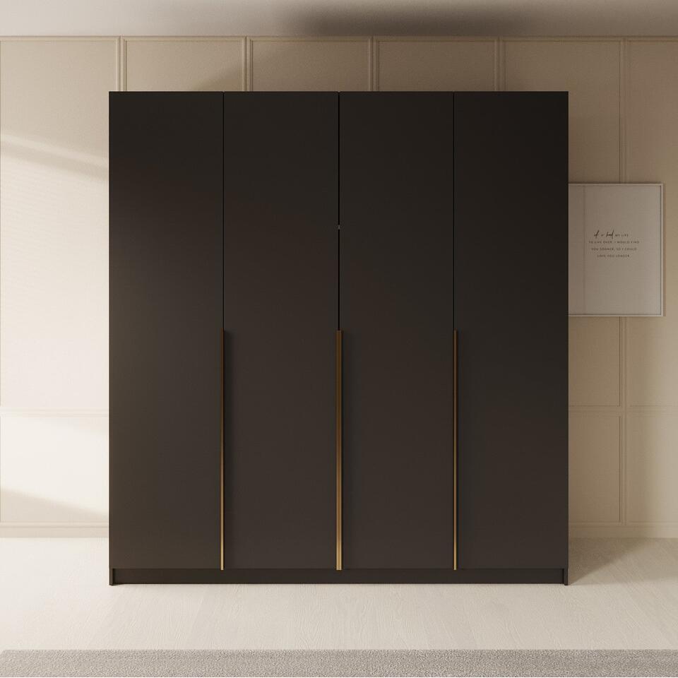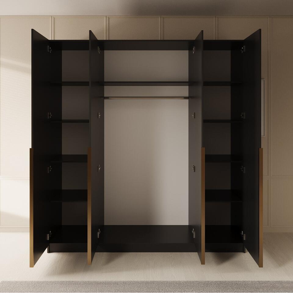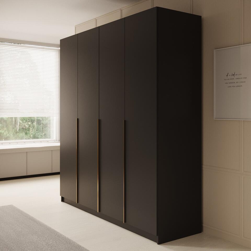 Kledingkast Sabre beschikt over 4 scharnierdeuren die openen met grote handgrepen in de kleur goud. De binnenkant bestaat uit 11 opbergvakken en 1 kledingroede. De kast is uitgevoerd in zwarte kleur in moderne stijl. Het meubel wordt ongemonteerd geleverd. Je dient het dus met behulp van de bijgeleverde handleiding zelf in elkaar te zetten.