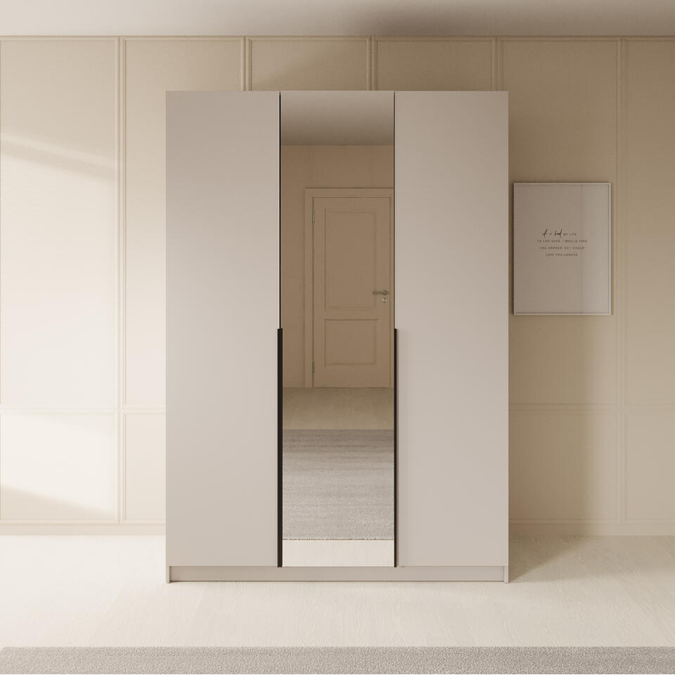Kledingkast Sabre beschikt over 3 scharnierdeuren die openen met grote handgrepen. De middelste deur is voorzien van een spiegel. De binnenkant bestaat uit 11 opbergvakken en 1 kledingroede. De kast is uitgevoerd in beige kleur met zwarte handgrepen. Het meubel wordt ongemonteerd geleverd. Je dient het dus met behulp van de bijgeleverde handleiding zelf in elkaar te zetten.